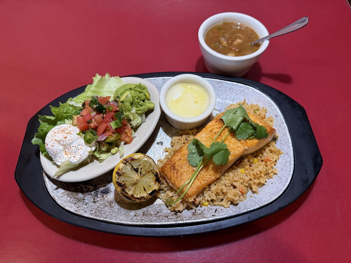 The red salsa and avocado green salsa have excellent flavor but not spicy which is how I like it. The sour cream chicken and chili con queso beef enchiladas and cilantro lime rice were very good.