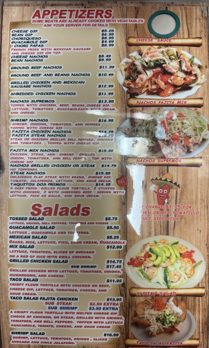 Choice of chicken or steak cooked with vegetables, cheese dip on top, served with lettuce, sour cream, rice and pico de gallo.