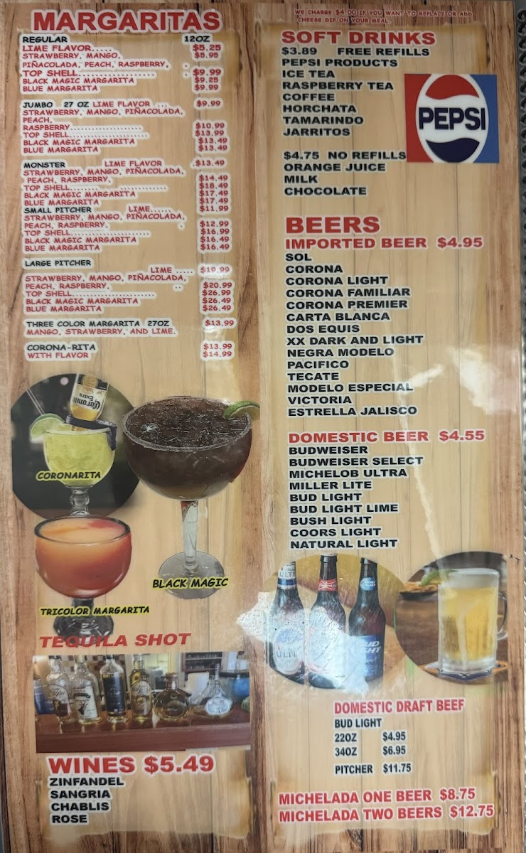 12'' tortillas filled with beef tips, chicken, pork and vegetables. Topped with cheese dip, red and green sauce.