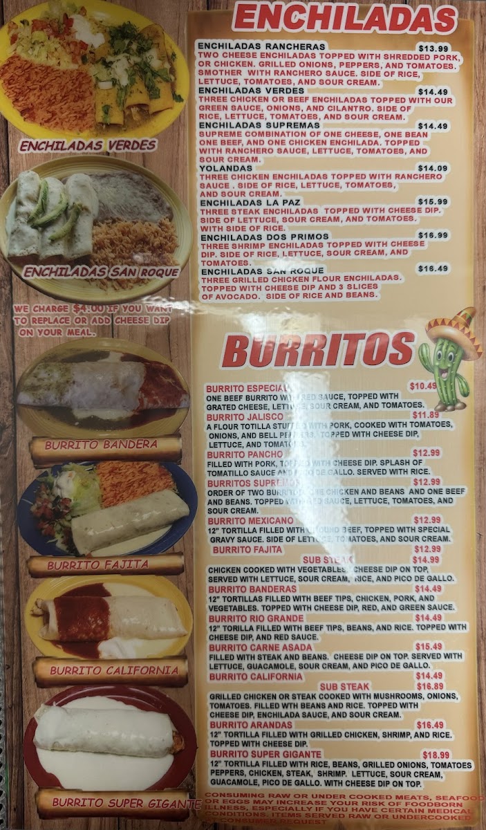 Grilled chicken or steak cooked with mushrooms, onions, tomatoes. Filled with beans and rice. Topped with cheese dip, enchilada sauce and sour cream.