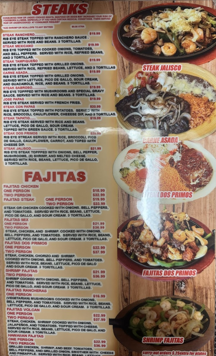 Served with rice or beans, lettuce, tomatoes and sour cream.