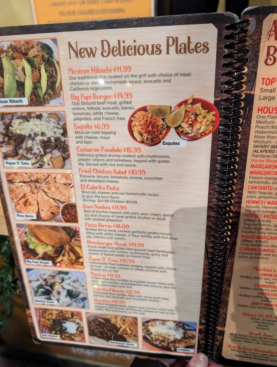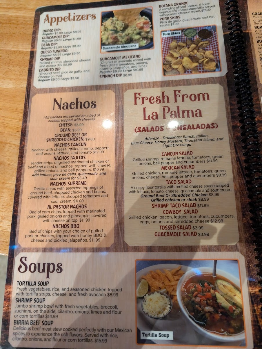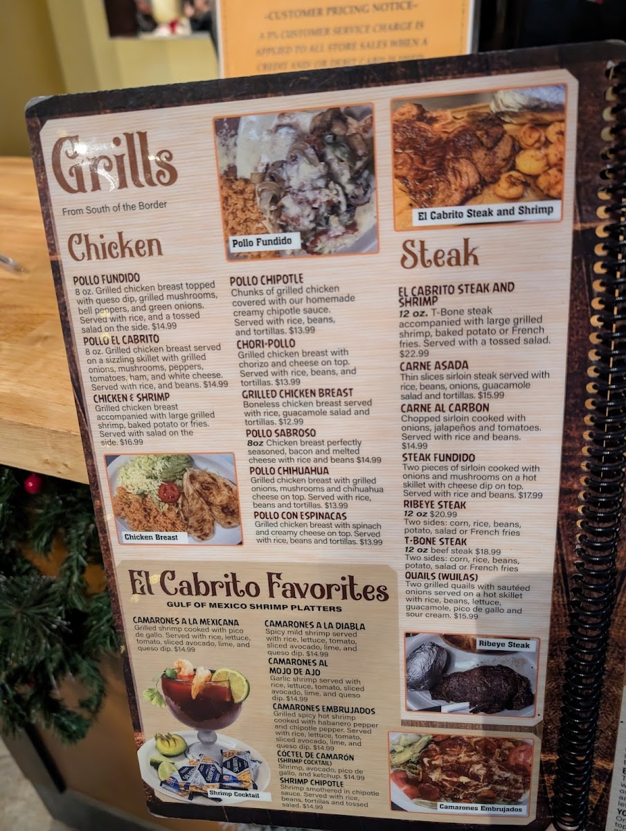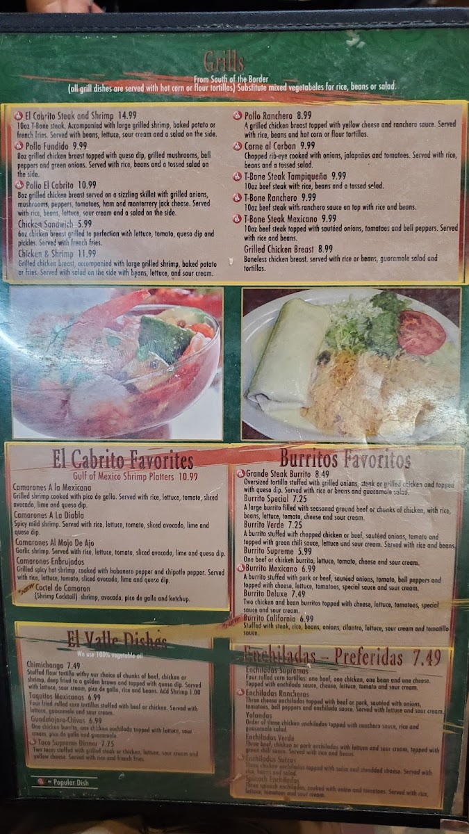 T-bone steak with grilled shrimp, baked potato or French fries, and served with salad, beans, & sour cream