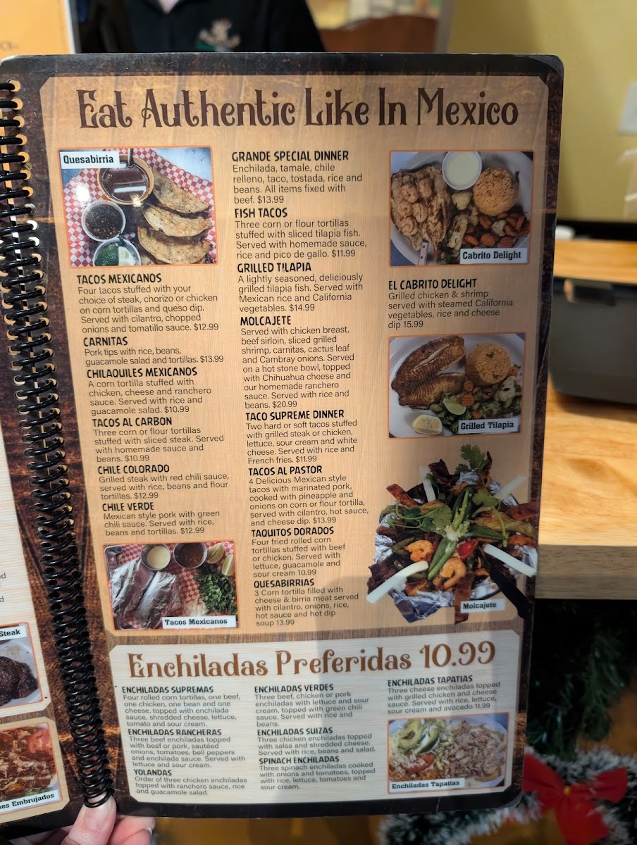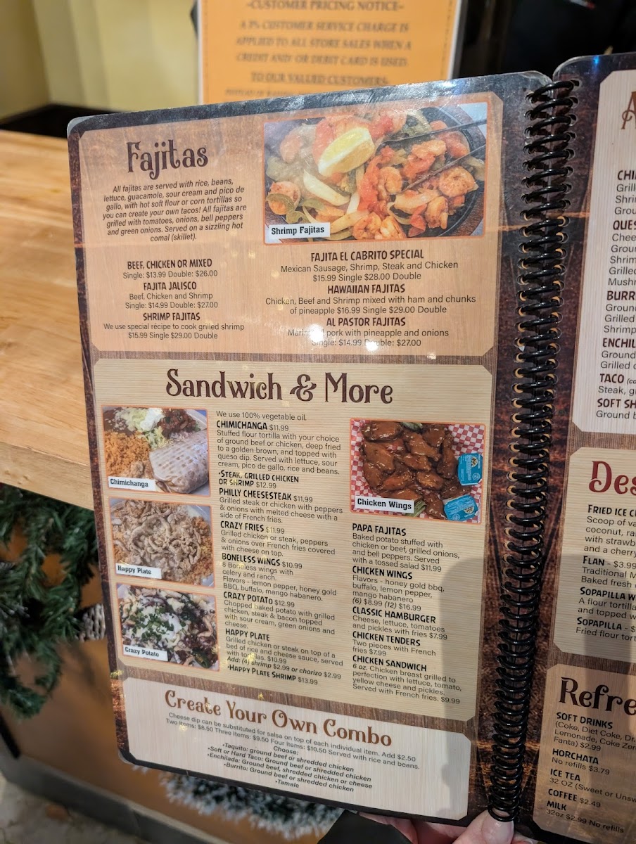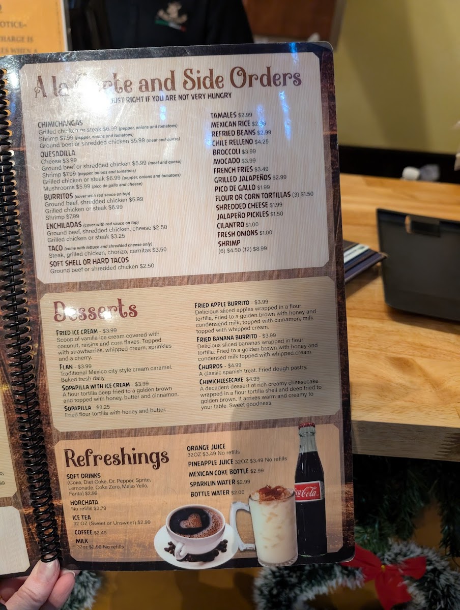 T-bone steak with grilled shrimp, baked potato or French fries, and served with salad, beans, & sour cream