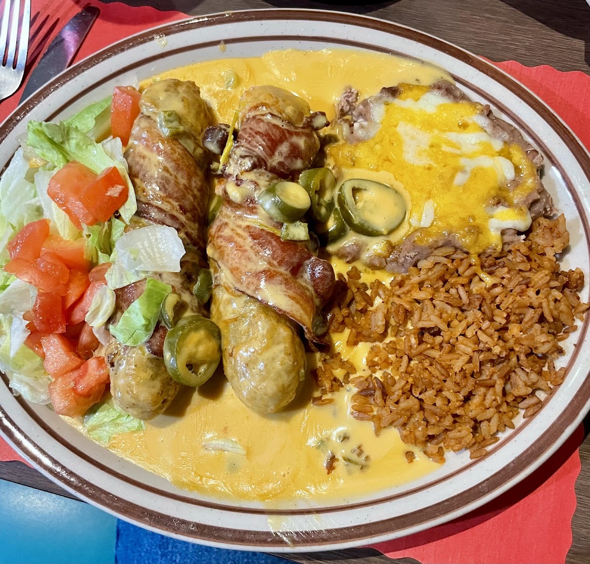 What a pleasant surprise! Must have: bacon-wrapped chile rellanos! Diabolical!