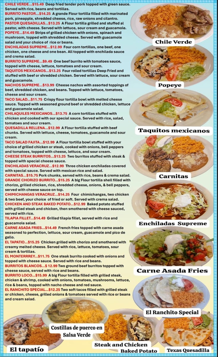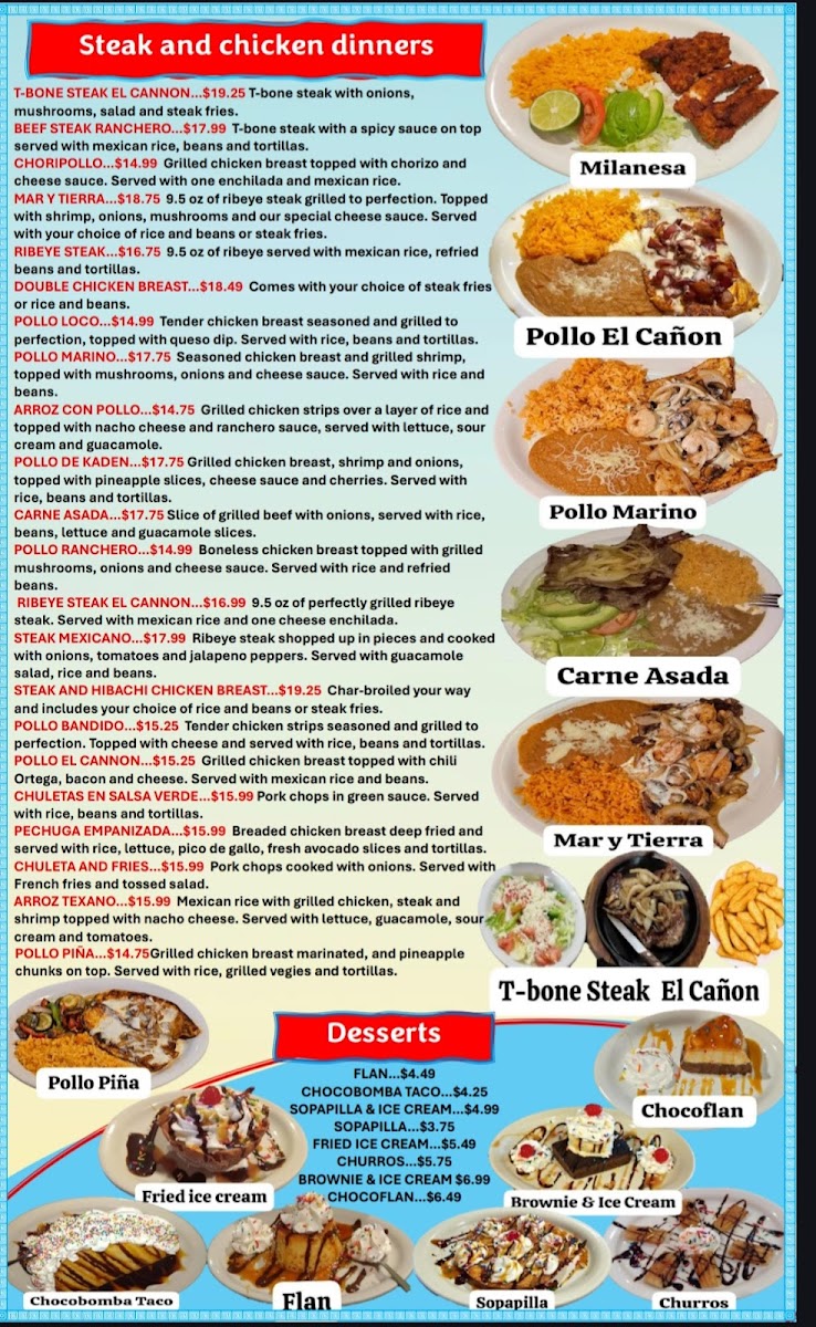 Grilled chicken or steak with rice or beans. Served with lettuce, sour cream and tomatoes.