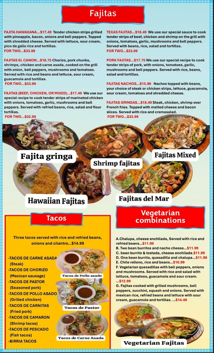Fajitas served with grilled mushrooms, bell peppers, zucchini, squash, and onions. Served with Mexican rice, re-fried beans, lettuce, sour cream, guacamole and three flour tortillas.