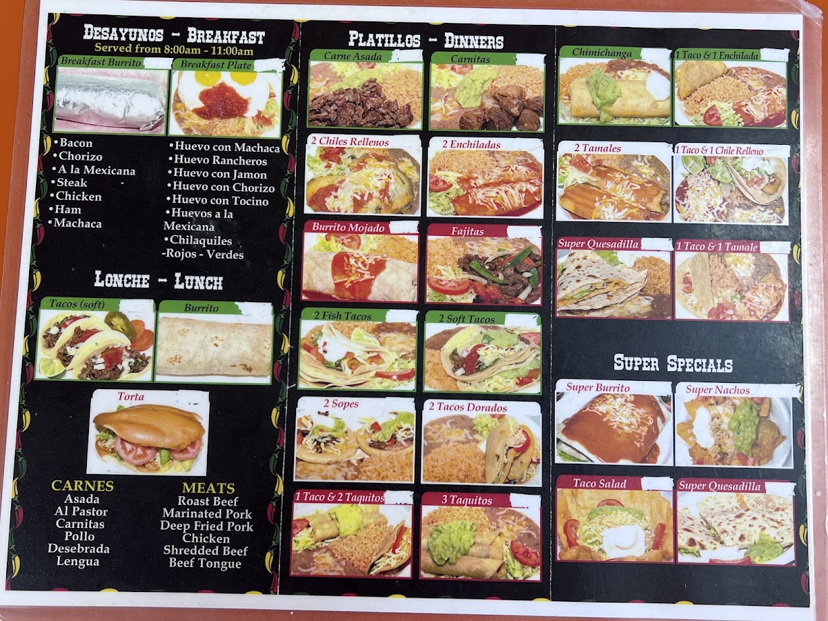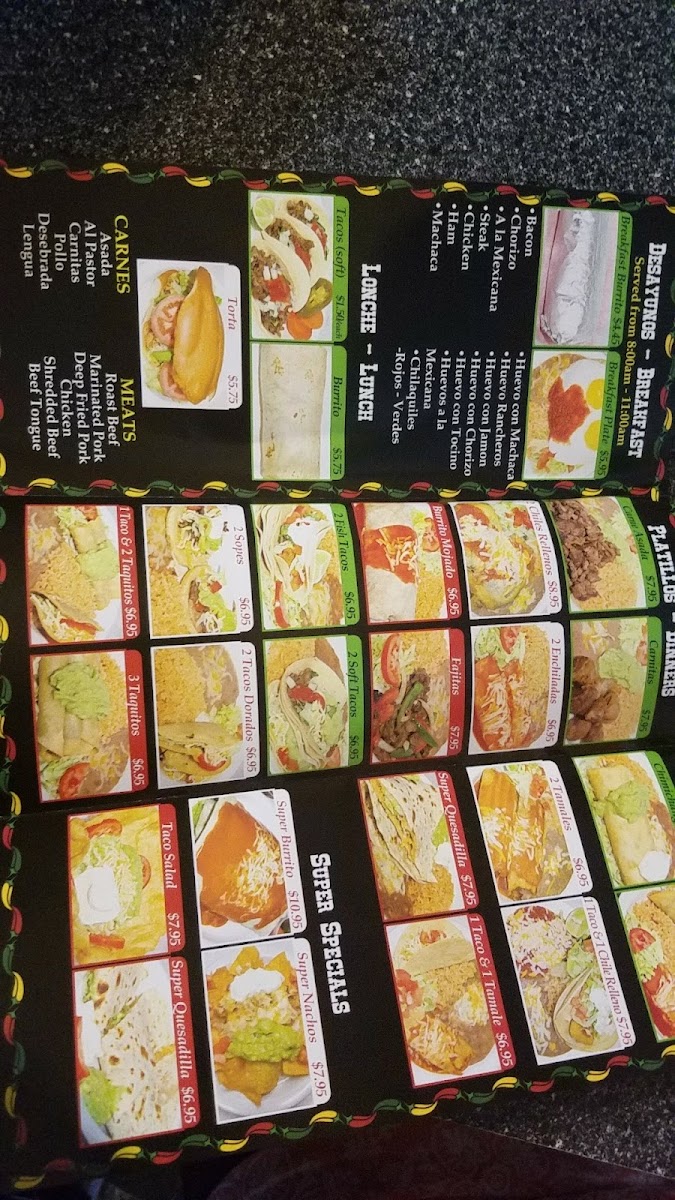 Meals served w/beans, rice & tortillas. Huevos con Machaca Huevos Rancheros Huevo con Jamon Huevo con Chorizo Huevo con Tocino Huevos a la Mexicana Chilaquiles Rojos o Verdes