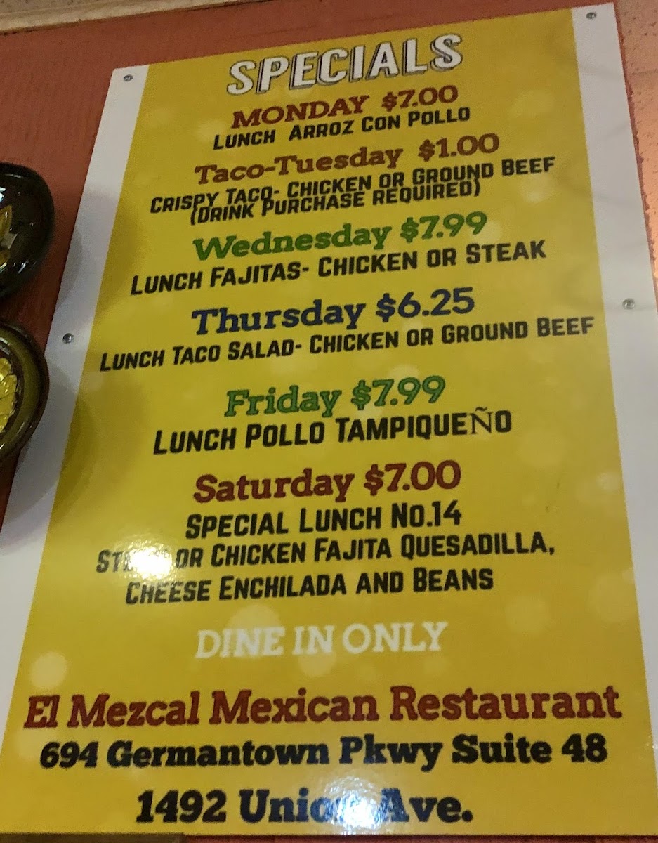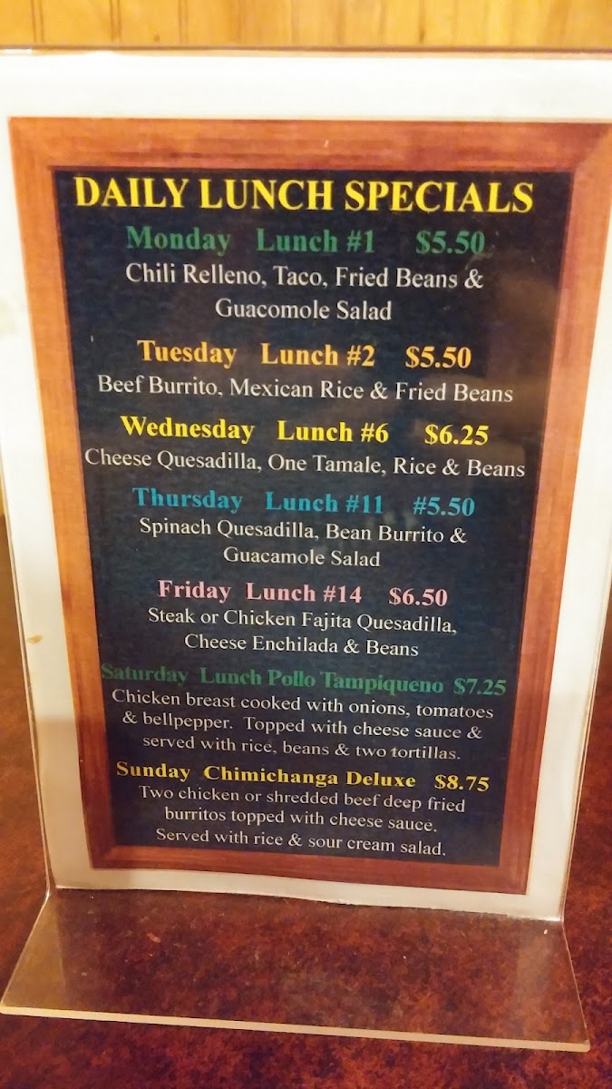 10" tortilla filled with spinach, grilled chicken, and cheese. Served with Mexican rice, lettuce, sour cream, and pico de gallo.