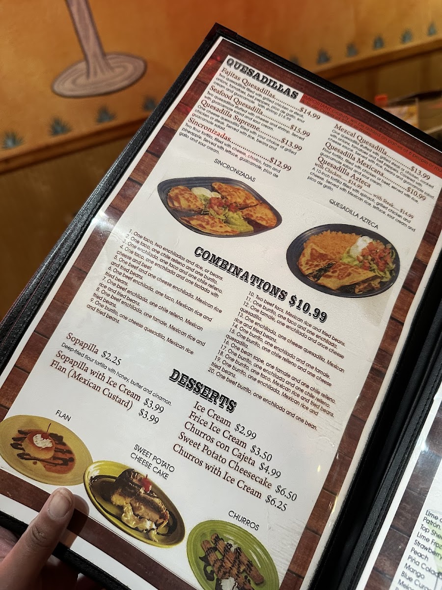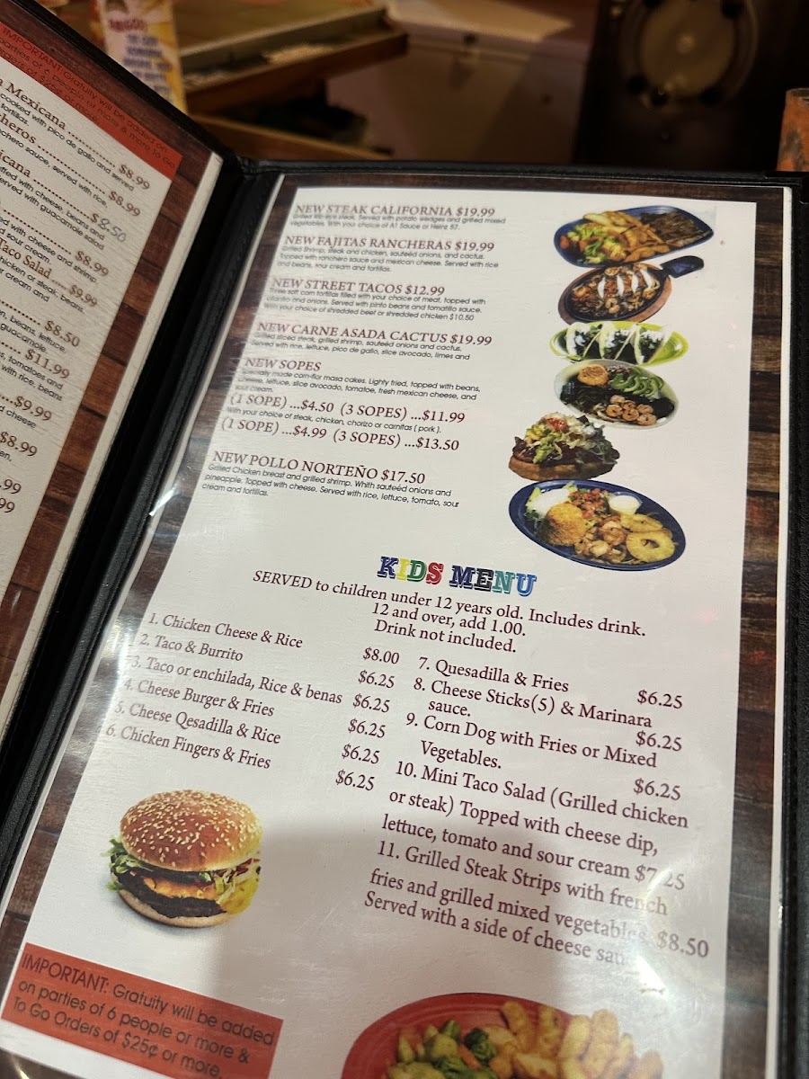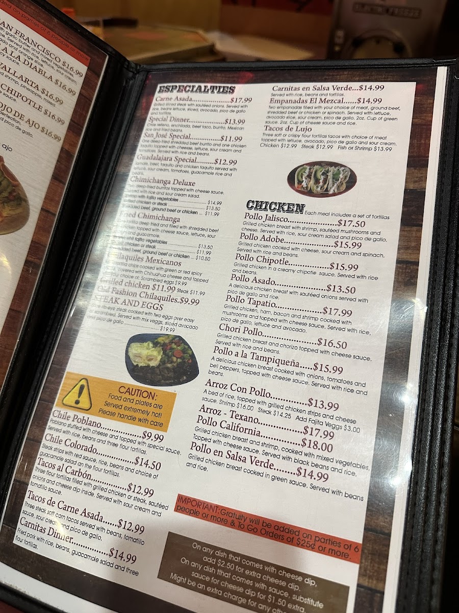 Ribeye slices, chicken breast slices, chorizo, cactus, (6) shrimp, queso fresco, chives, and jalapeño. Covered with special sauce.