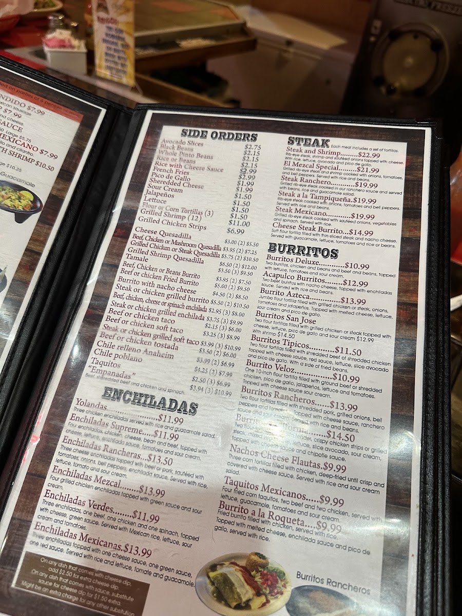 10" flour tortilla filled with thin sliced steak, topped with cheese dip. Served with guacamole, lettuce, tomatoes, and rice or beans.