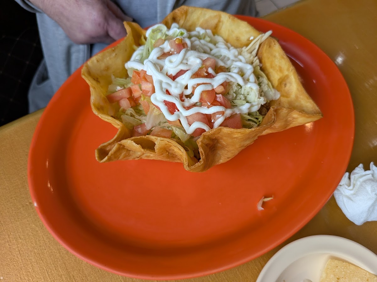 I don't hardly ever like corn chips. Like EVER. I dint even bother to TRY ppls corn chips. I got some in a take out order and started to throw them out-but took a nibble off of one...IM HOOKED. They are so crisp and perfectly thin, almost like AMSR for the mouth. No salt ( I hate that, dump that salt on!)... but I salted them myself. I don't know why french fries and chips have to be a health food all of a sudden but if I order fried food- um I probably am not caring about the SALT. So there's that. I ordered the Taco Salad. It was average.