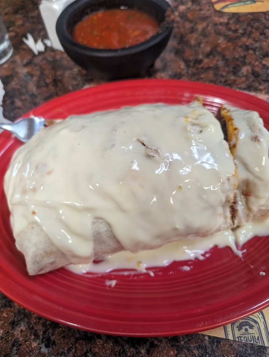 Food is great I love their french fries I think like they had the best friends forever tasty but my favorite is the fat burrito with the white queso on it oh my God that is so good oh yeah the Pina colada mwaaah