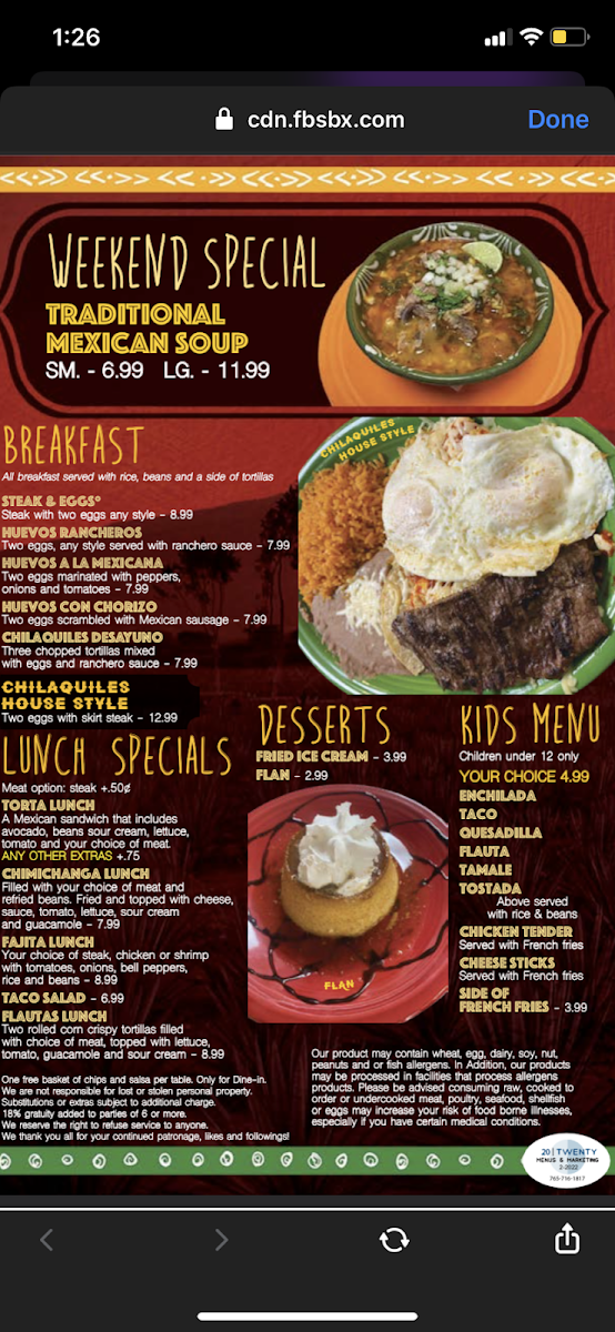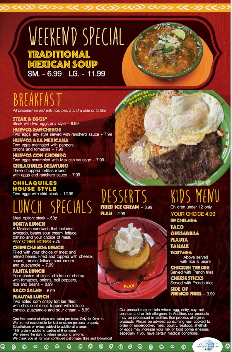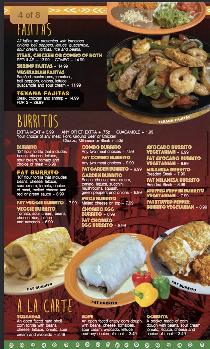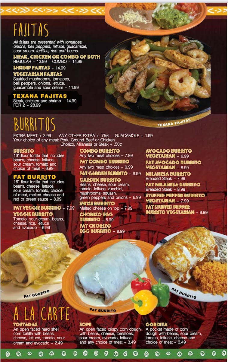 16" flour tortilla that includes beans, cheese, lettuce, sour cream, tomato, choice of meat, melted cheese and red or green sauce.