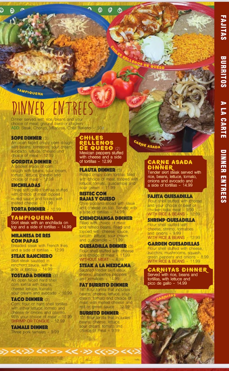 Your choice of steak, chicken or shrimp with tomatoes, onion, bell peppers, rice and beans.