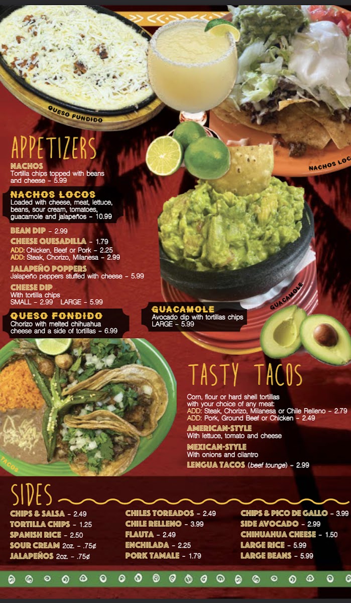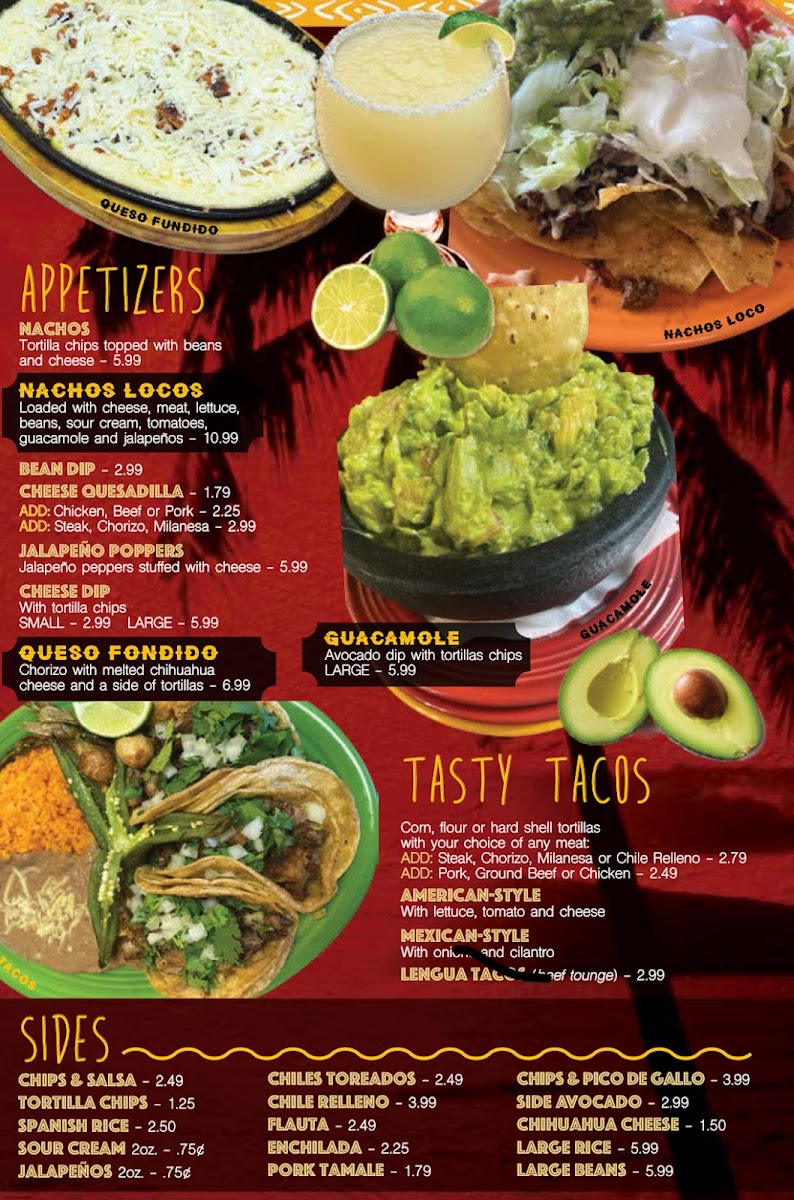 Filled with choice of meat and refried beans, fried and topped with cheese, sauce, tomato, lettuce, sour cream and guacamole.