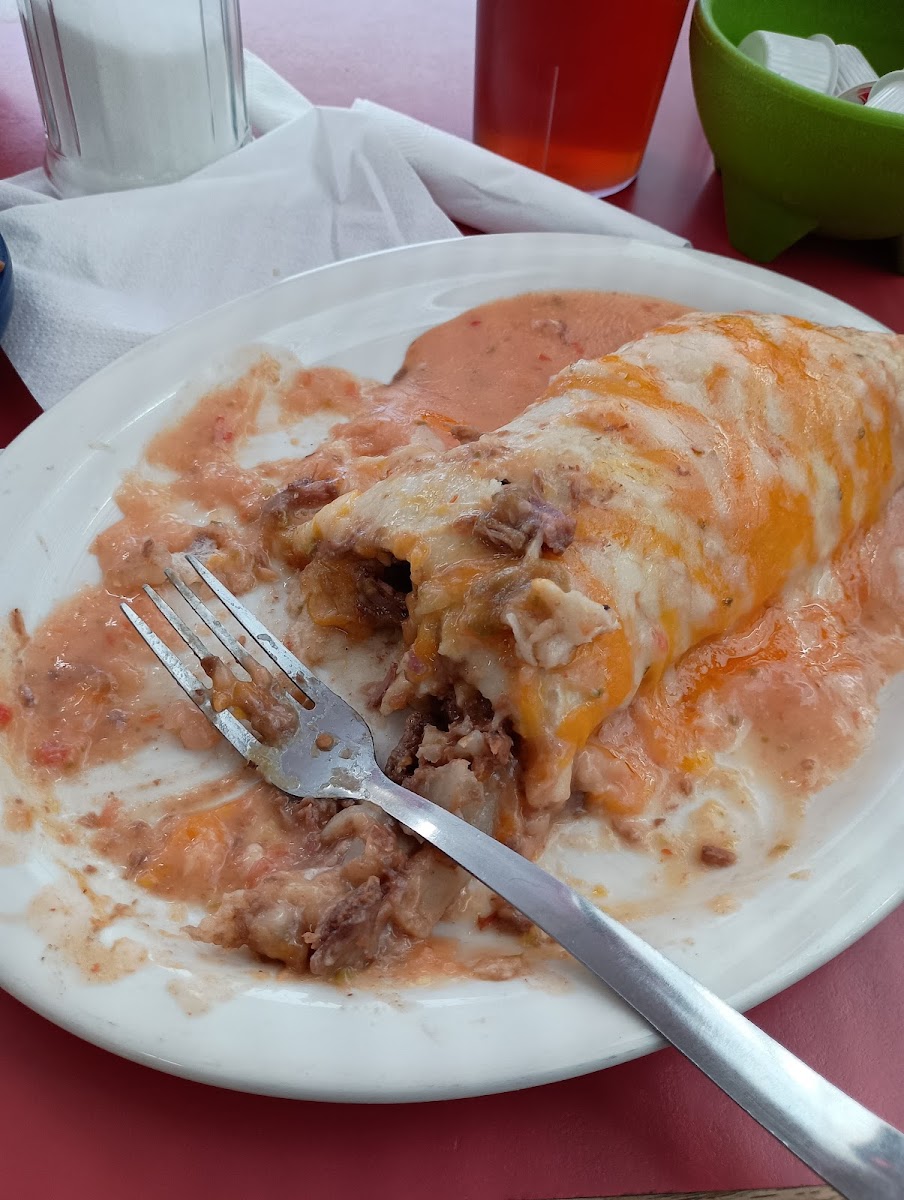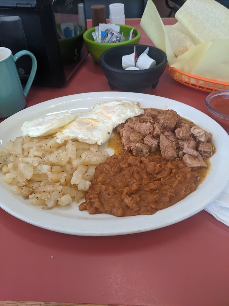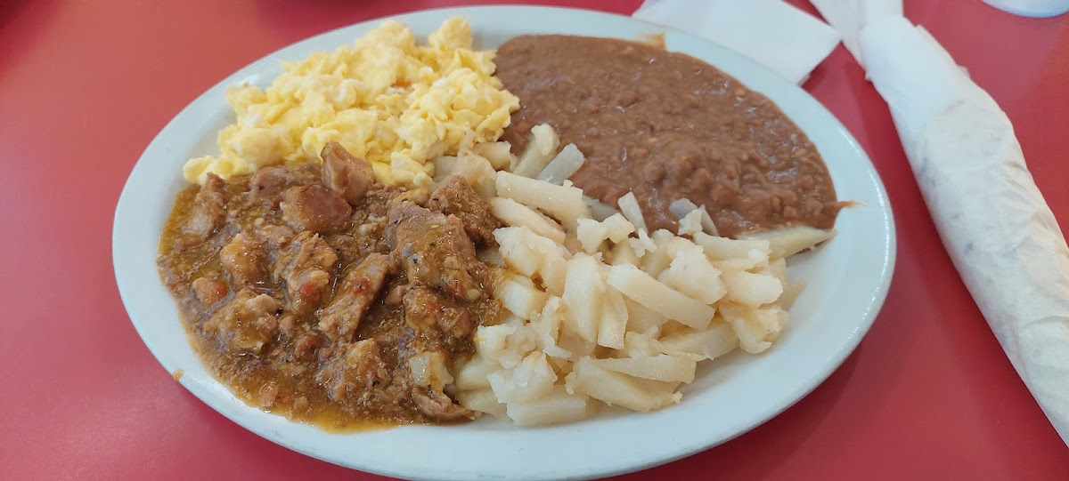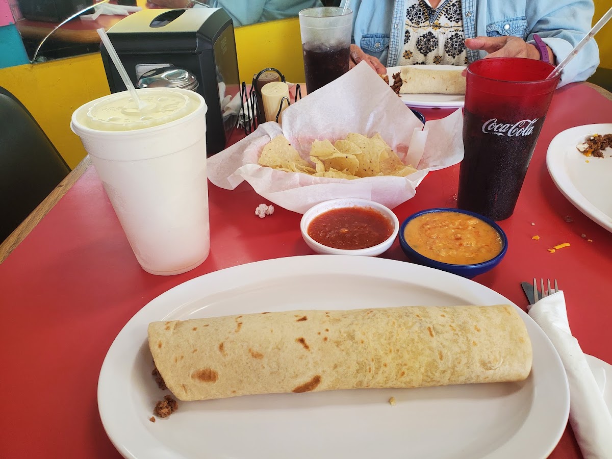 Love this quiet little homemade style meals. It's like eating at my abuela . Fresh tortillas. Fried potatoes Refried beans. Fresh menudo chose from a small or large burrito . Delicious!!