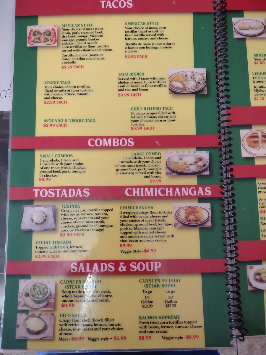 3 tacos with your choice of meat (steak, chicken, ground beef, pork, lengua, chorizo or cecina) or veggie tacos with your choice of corn, flour tortilla hard shell corn tortilla. Served with rice and beans.