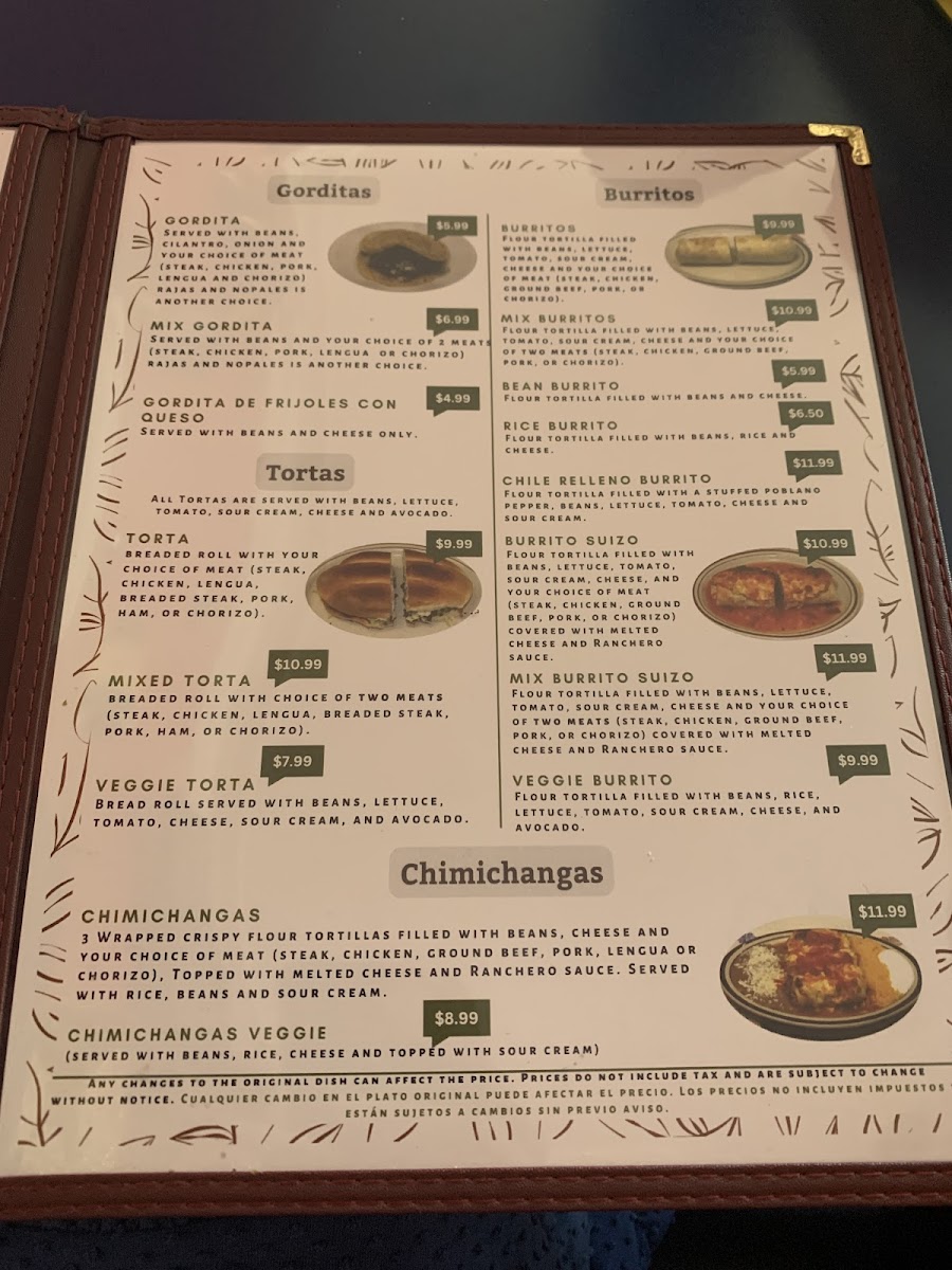 Served with beans, cilantro, onion and your choice of meat (steak, chicken, pork, lengua and chorizo) rajas and nopales is another choice.