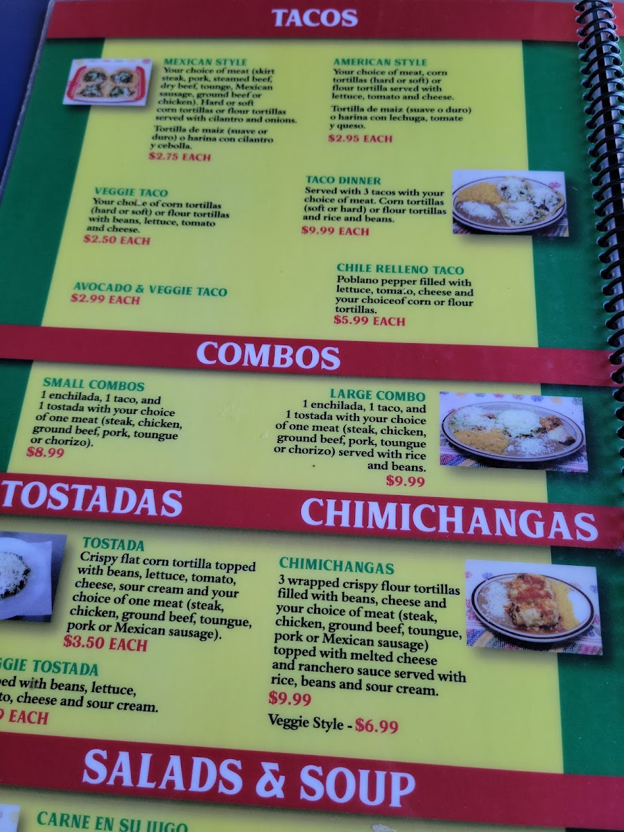 4 corn or 3 flour tortilla covered with red or green sauce and filled with your choice of meat (steak, chicken, ground beef, pork, lengua or chorizo with potato) served with rice, beans and salad.