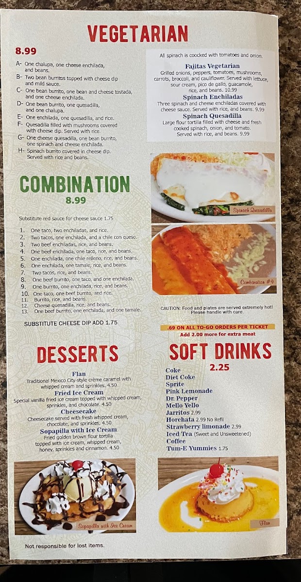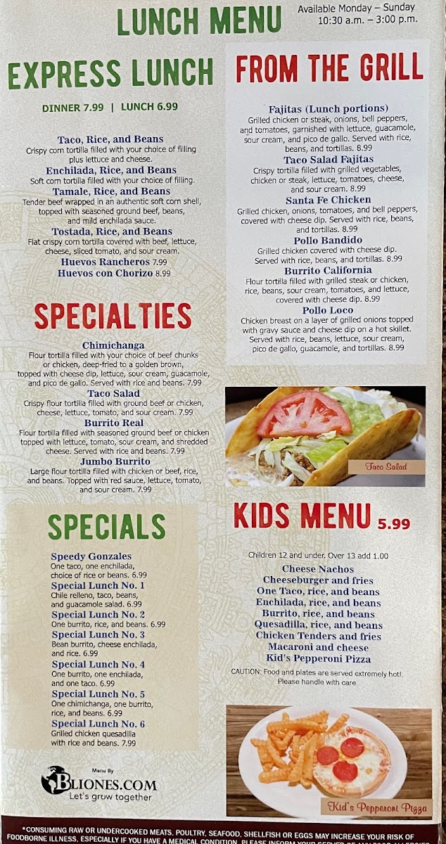 Flour tortilla filled with seasoned ground beef or chicken, topped with lettuce, tomatoes, sour cream, and shredded cheese. Served with rice, beans, and covered with red sauce.