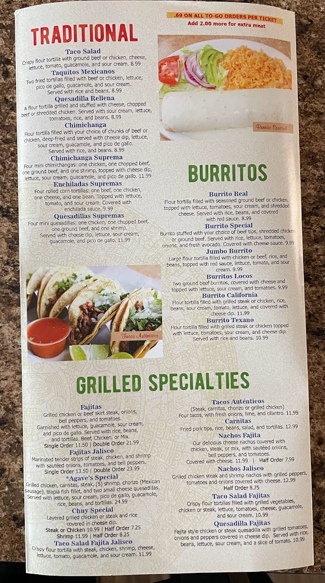 Flour tortilla filled with grilled steak or chicken, topped with lettuce, tomatoes, sour cream, and cheese dip. Served with rice and beans.