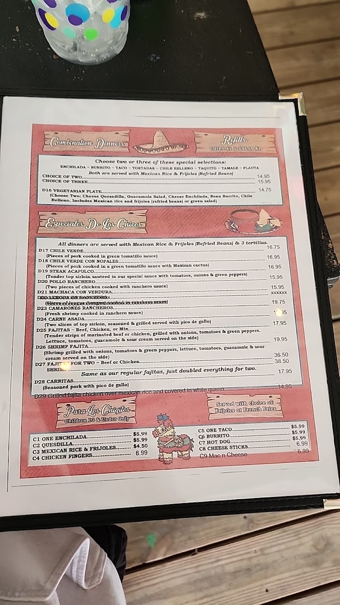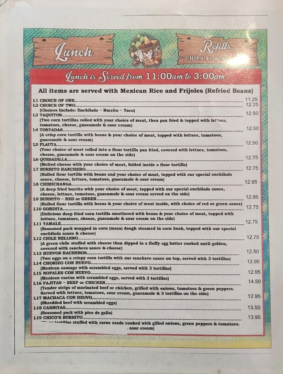 Choose two: cheese quesadilla, guacamole salad, cheese enchilada, bean burrito, chile relleno. Includes Mexican rice and frijoles (refried beans) or green salad)