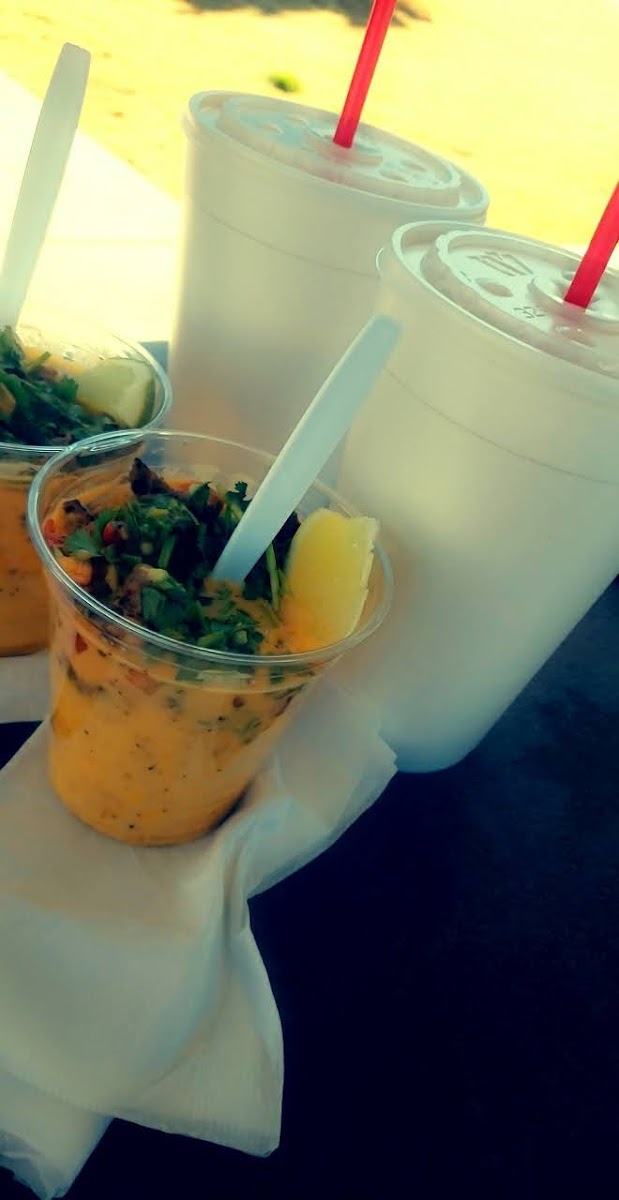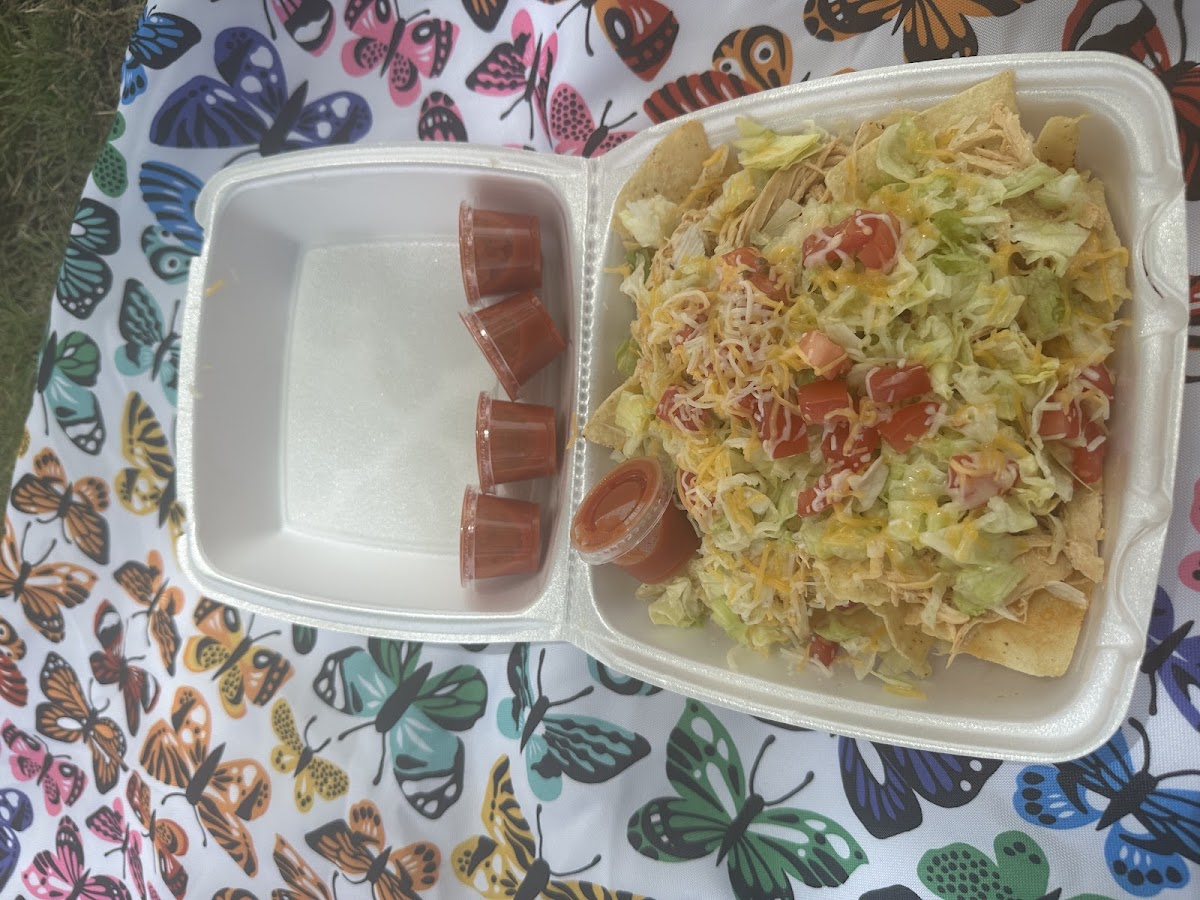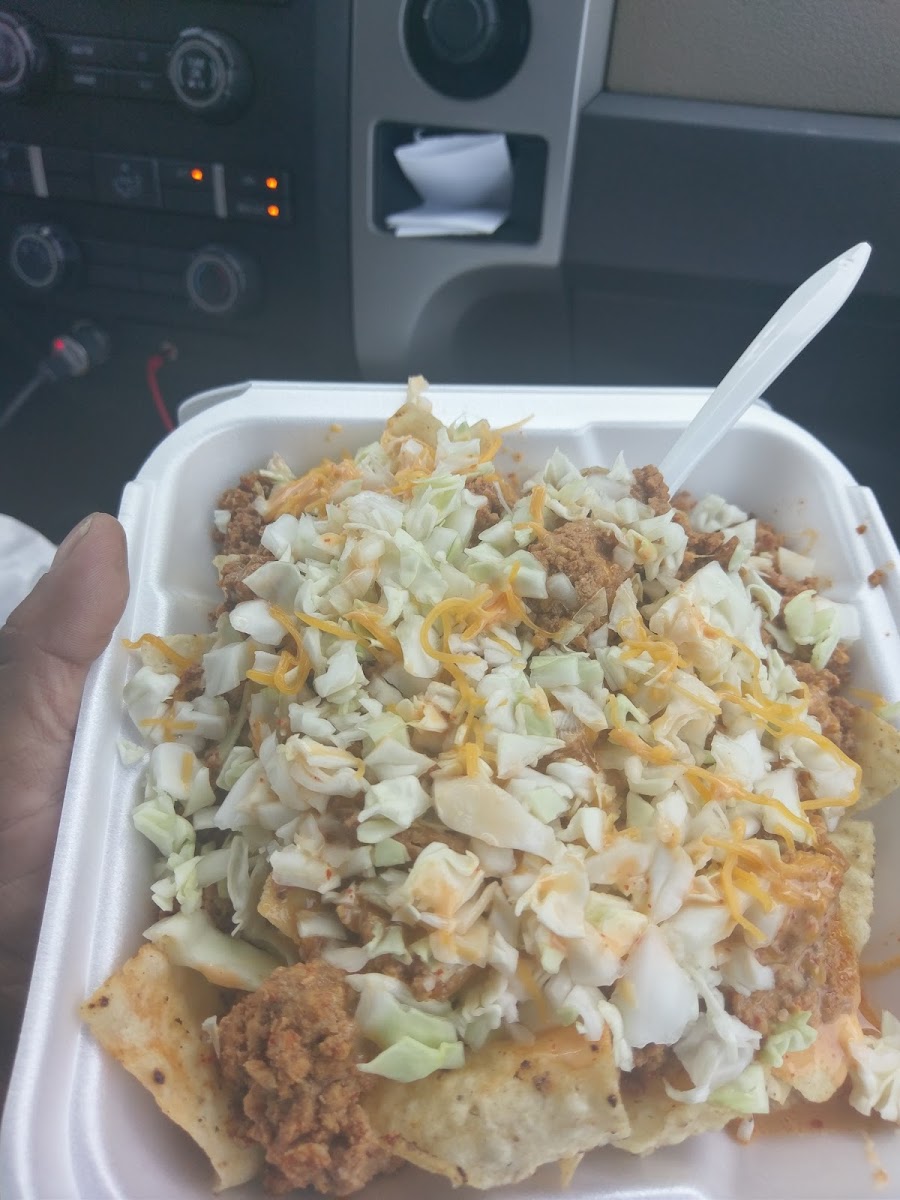 I had the chicken nachos! I have tasted them before and always thought they were tasty, but this was my first visit in person. It was a bit busy because it was the lunch hour. Despite the busyness, it took only 15 minutes for my order. The seating area I do not recommend sitting at because it was a bit funky although it is conveniently shaded. My server was super sweet and gave me lots of extra sauce for my nachos. The prices were fairly reasonable, especially for the amount of food you get.