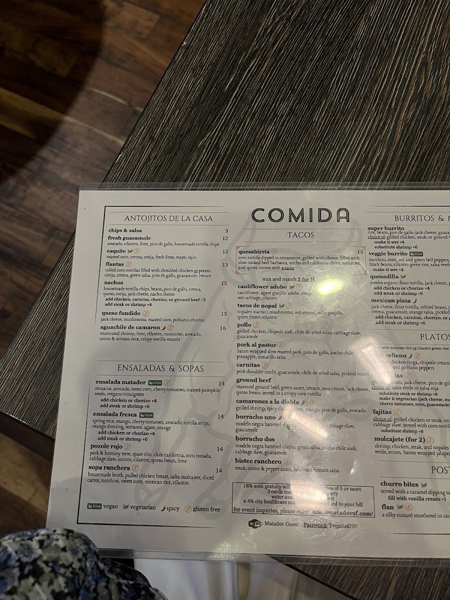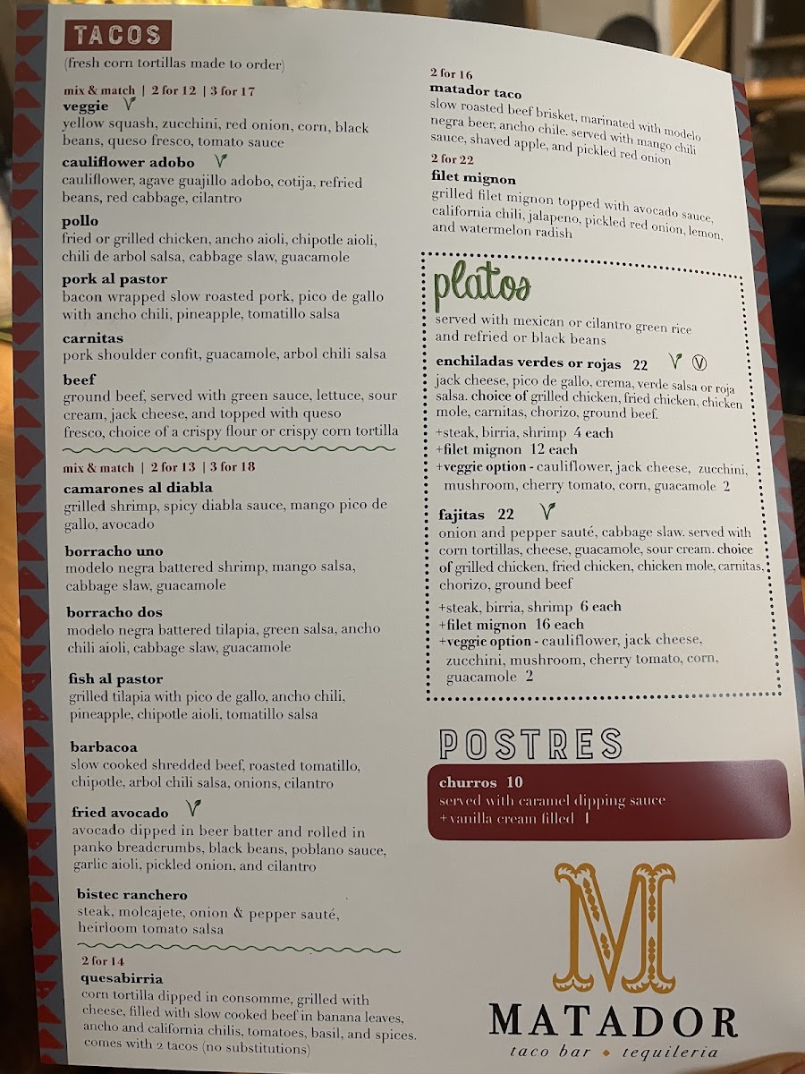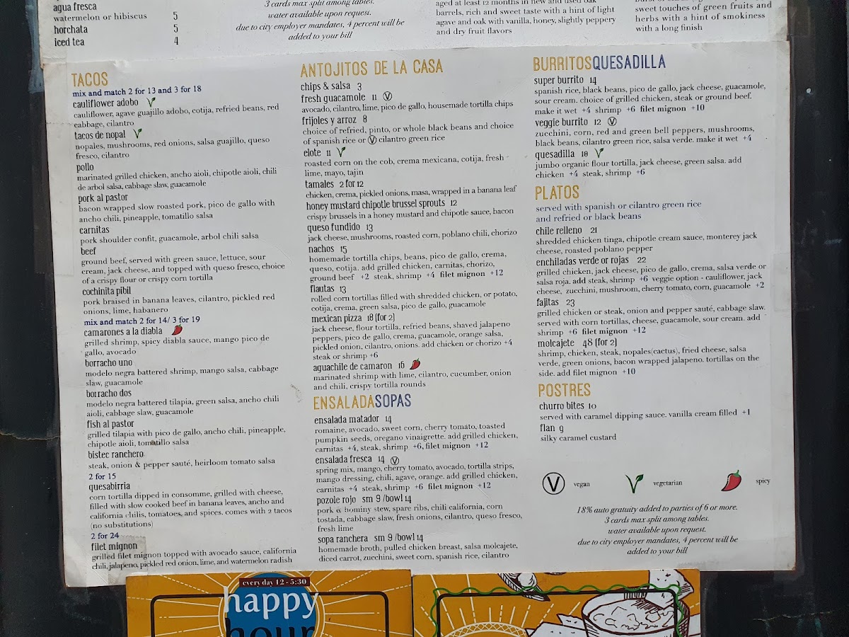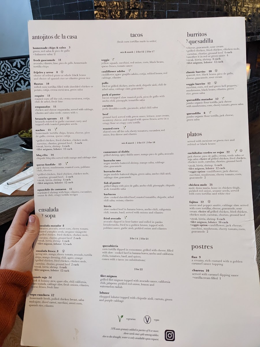 Rolled corn tortillas filled with shredded chicken or potato, cotija, crema, green salsa, pico de gallo, guacamole, lettuce