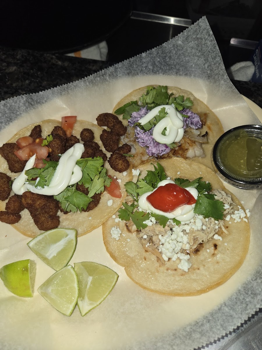 First of all, Kim was great! Funny, friendly, and a foody!! Ordered 3 tacos (shrimp, the goat(chicken), and the grouper. We also had to try the pizza, a half meat lovers, half Mandalay chicken pizza. The tacos were great, fresh, flavorful etc. The meat lovers was good, crispy, and I would order again. The chicken on the pizza, tasted fishy almost, like a canned chicken that was not fresh at all. Kim was very accommodating and apologized, not her fault... but i would definitely go back! Good music playing and it was very low key for a Saturday night!