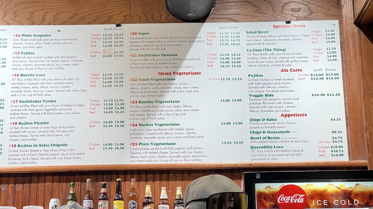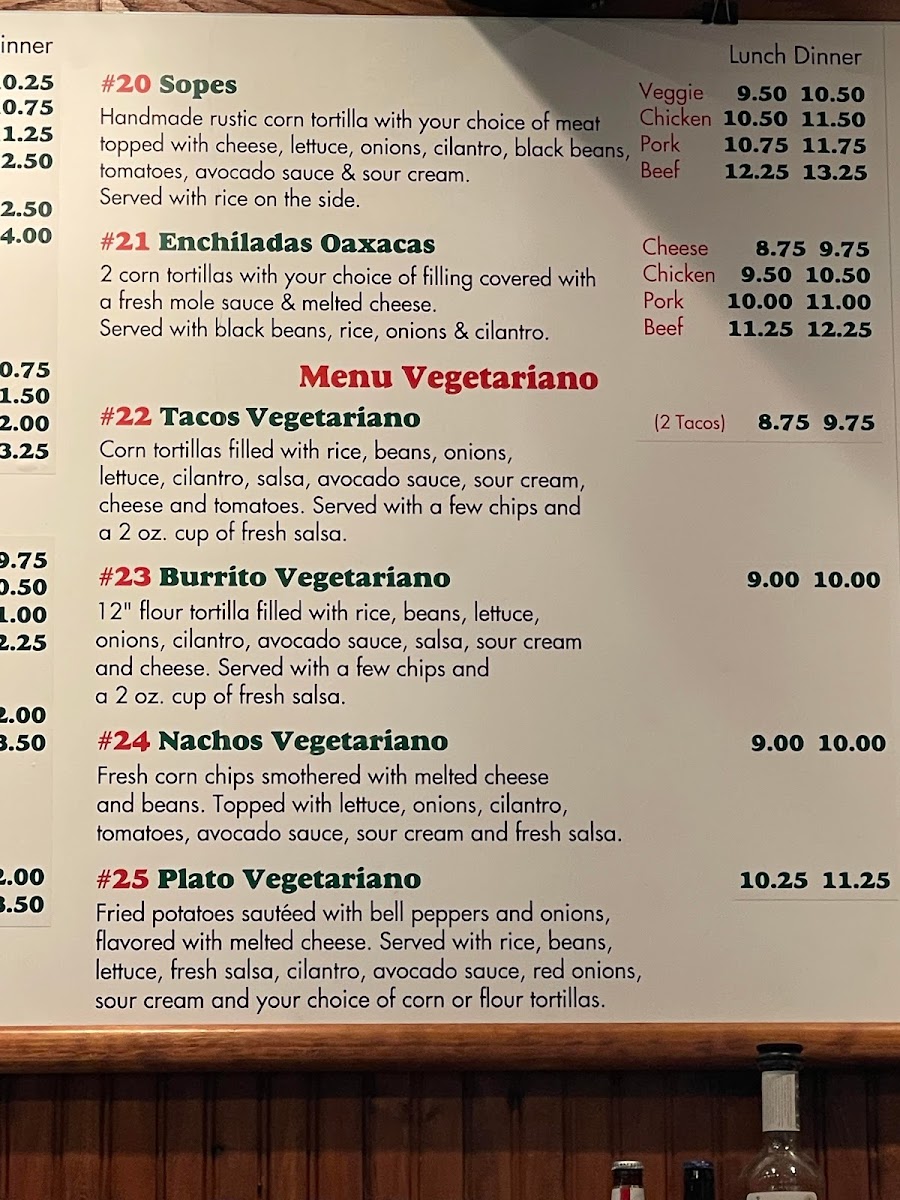 corn tortillas filled with rice, beans, onions, lettuce, cilantro, salsa, avocado sauce, sour cream, cheese and tomatoes. served with a few chips and a 2 oz. cup of fresh salsa