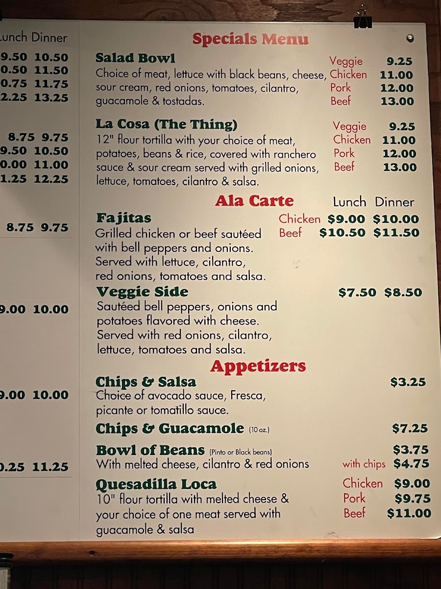 12" flour tortilla filled with rice, beans, onions, lettuce, cilantro, avocado sauce, salsa, sour cream and cheese. served with a few chips and a 2 oz. cup of fresh salsa.