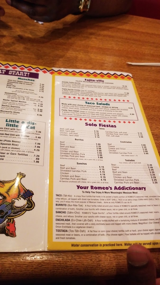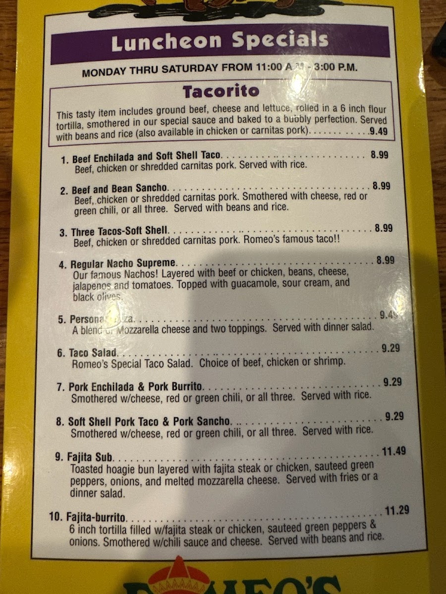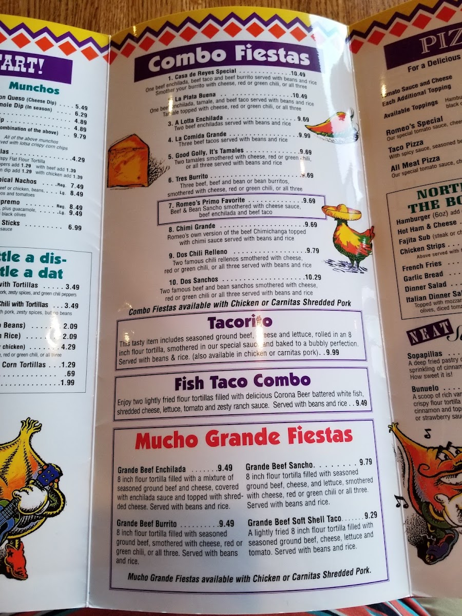 (Two 6" tortillas). A steak fajita rito and a chicken fajita rito, each filled with sauteed green peppers and onions, smothered with chili sauce and topped with shredded cheese. Served with beans and rice.