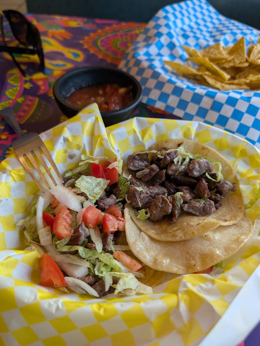 This is a pretty good Mexican restaurant with courteous staff and quick service. My taco was kind of lack luster but still good. The interior is OK and they have a chip and salsa bar for people ordering food. This is a pretty good place to over time try out the full menu, and isn't overpriced.