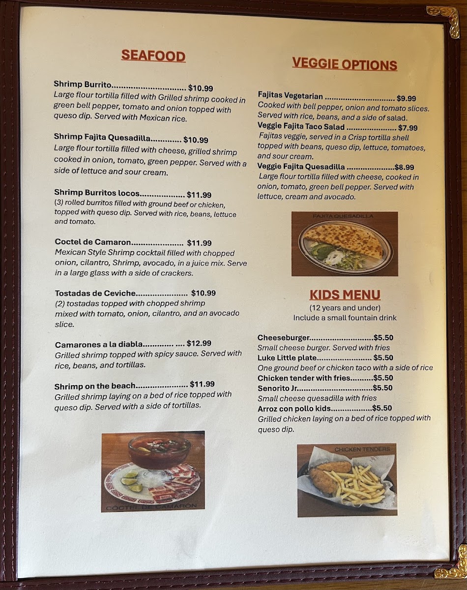 Seafood, veggie options, Kids Menú