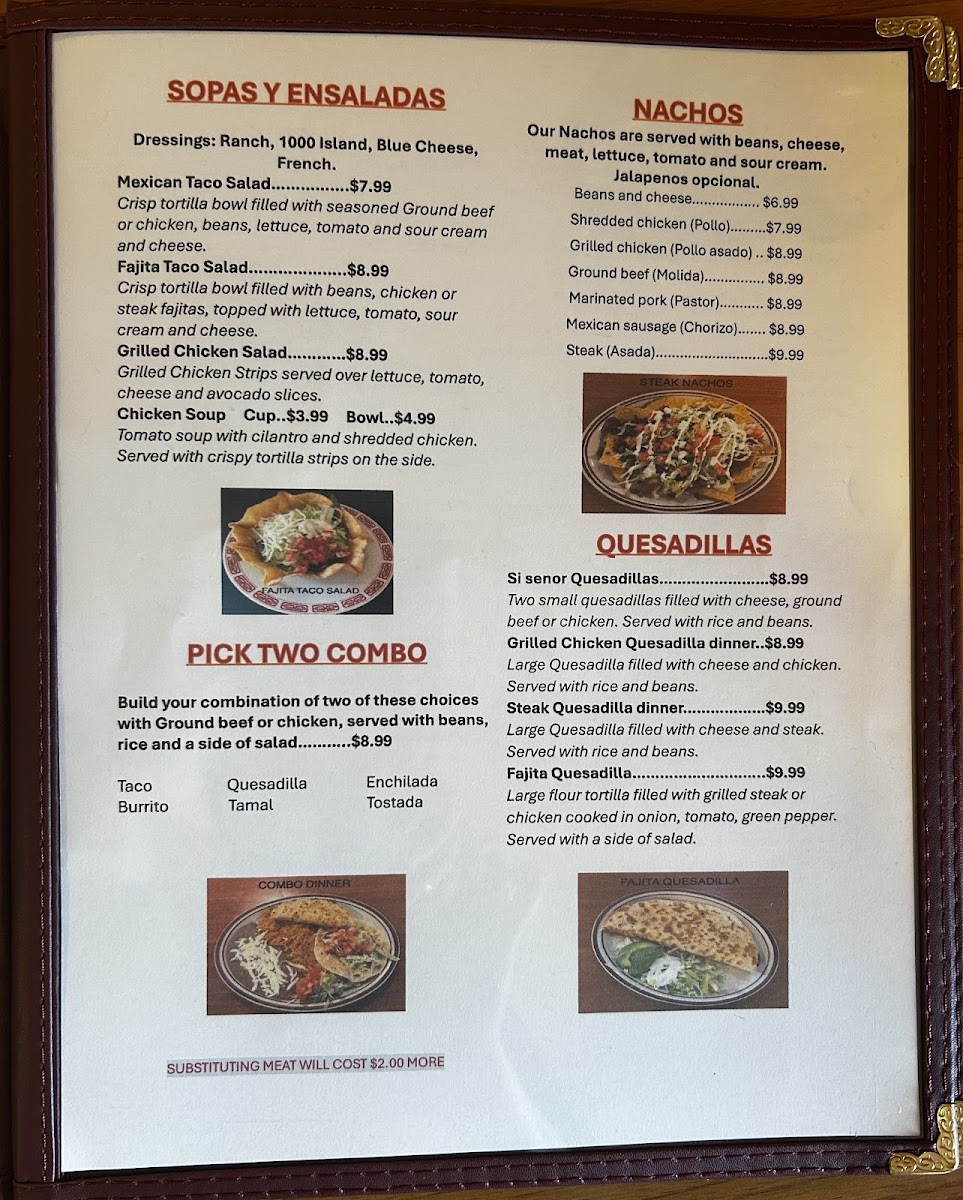 Sopas y ensaladas, Nachos, Combos, Quesadillas