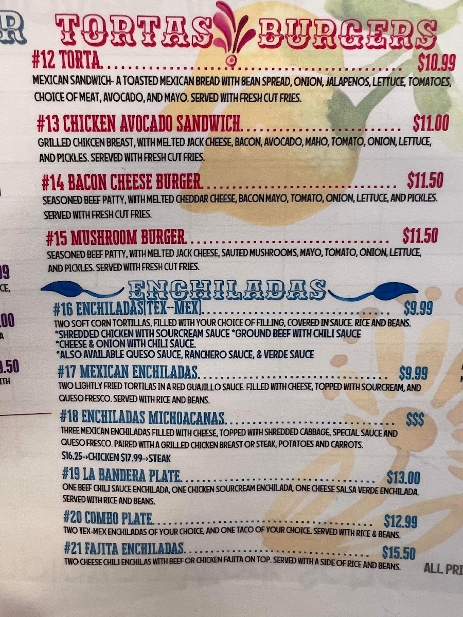 Mexican sandwich with bean speread, mayo, lettuce, onion, jalapenos, tomatoes, avocado and your choice of fajita beef, fajta chicken, carnitas or pastor meat. Served with a side of fries.