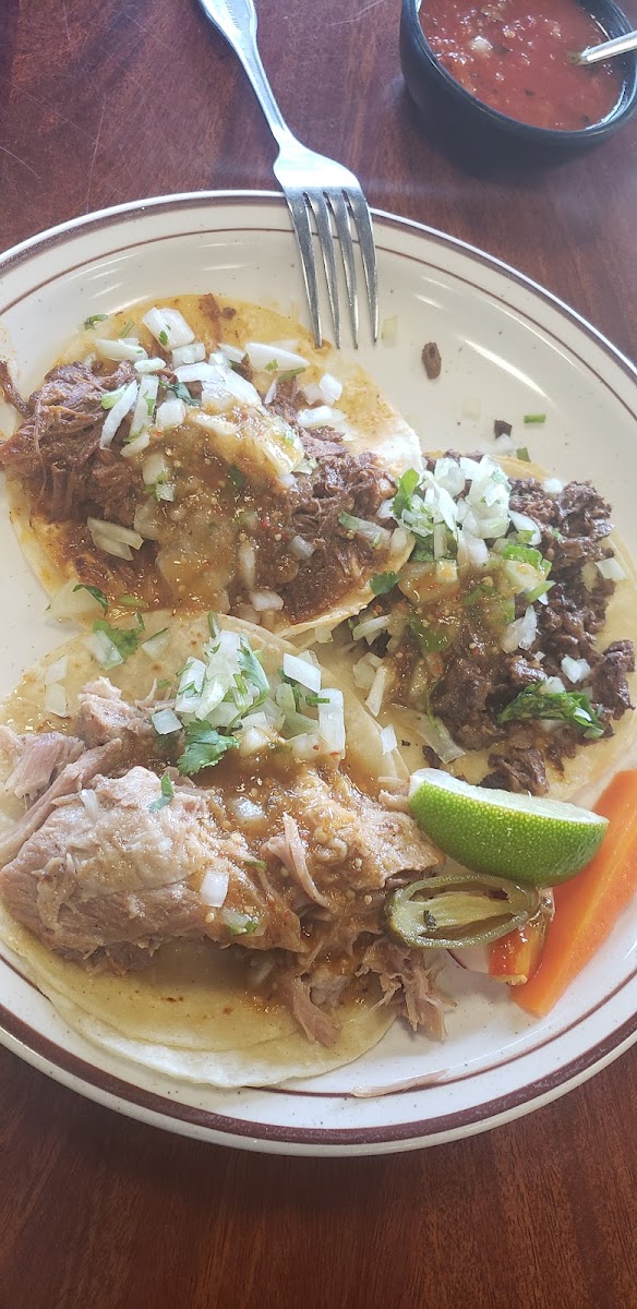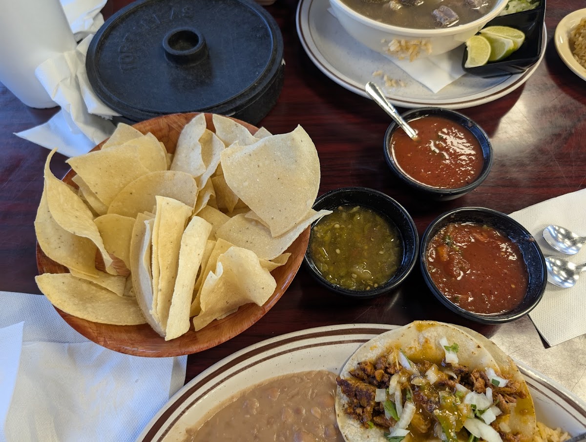 Food was absolutely delicious and the service was fast and friendly. Plenty of seating for a busy lunch rush. We ordered the tacos, which were priced great at $2.95 a taco. There are multiple meat options, we got chicken (pollo), steak (carne asada), and pork (carnitas). The tacos came on (2) homemade corn tortillas, generous helping of delicious meat, diced white onion, cilantro, and a splash red salsa. They ask if you want everything on it when you are up under the order here queue, so you can customize it as well. Sat down after ordering and they brought out complimentary chips and salsa. The chips were freshly fried and thin and crispy, not too salty but salt and pepper at the table. Salsa was a mild spice level, thin in consistency for sure had thinly diced chunk too it too, had a heavy flavorful tomato base, it also had onion and cilantro and almost marinara like flavor very unique salsa but I found it delicious and clearly distinctive to the restaurant. My only qualm was there wasn't music playing, which is entirely a personal preference. I felt very present though listening to the sounds of cooking from the kitchen and background conversation from the other patrons but full of people having a good time with friends and family. They also had TVs with different channels, no sound, if you need your sports.