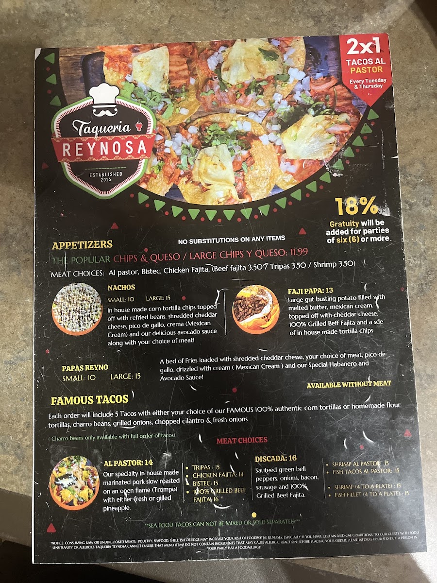 Order includes tacos with your choice of our Famous 100% corn tortilla or Flour tortilla, our delicious charro beans, fresh chopped cilantro, onion, limes and grilled onions as well!