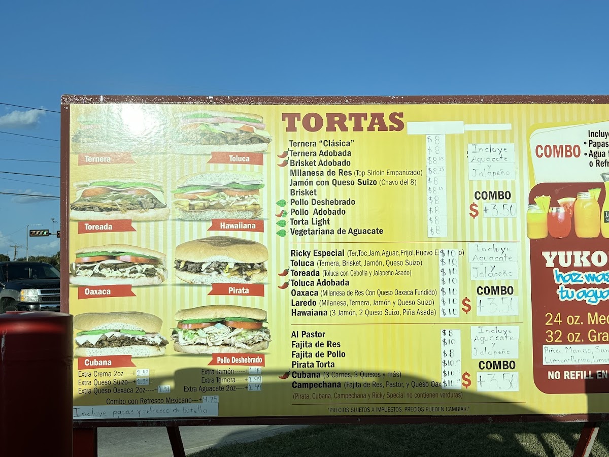 Incluye papas fritas, agua fresca o refresco. Lleva Ternera, Milanesa, Jamón, Queso suizo, cebolla asada, jalapeño asado, tomate, lechuga, cebolla, frijol, mayonesa y aguacate