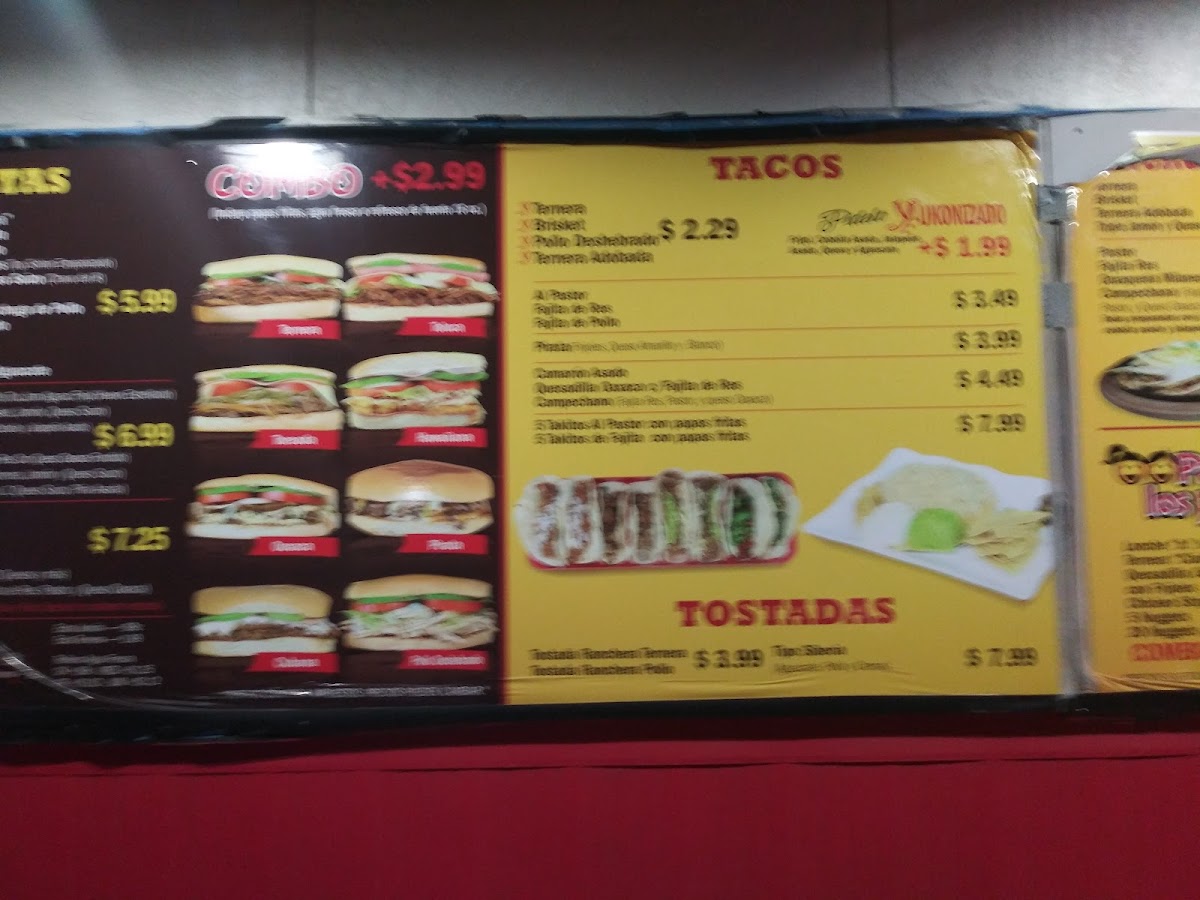 Incluye papas fritas, agua fresca o refresco. Lleva Ternera, Brisket, Jamón, Queso suizo, cebolla asada, jalapeño asado, tomate, lechuga, cebolla, frijol, mayonesa y aguacate
