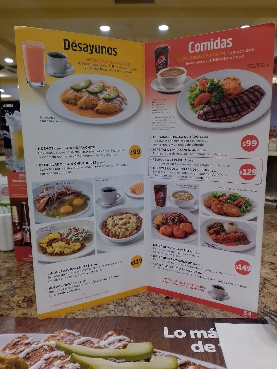 Incluye: una sopa del dia, una bebida y café americano refill. **Un vaso (360 ml) de refresco, agua de sabor. limonada, naranjada o botella de agua (600 ml). No incluye refrescos en lata.