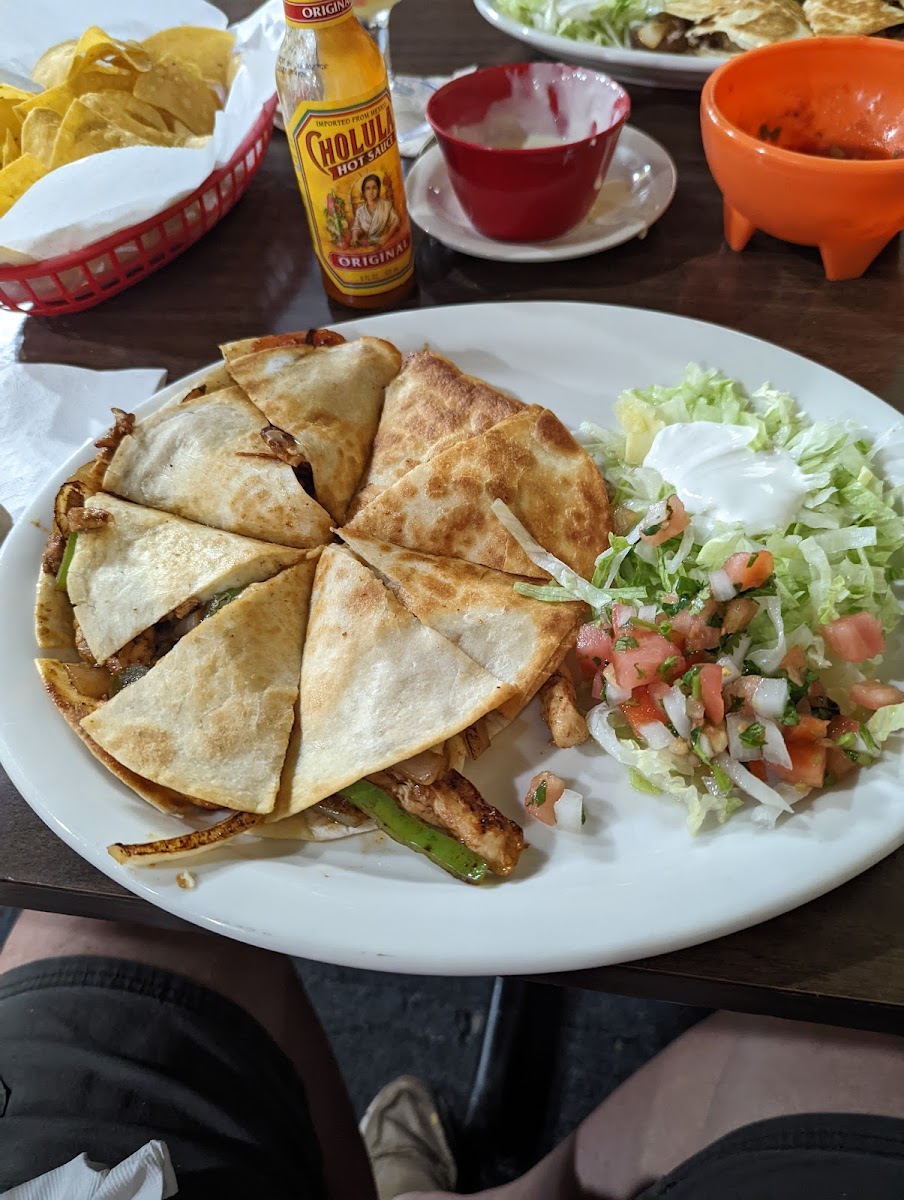 Happy to find this diamond on traveling back home from vacation. First Mexican meal in 10 days did not disappoint. Best tortilla chips I've ever had! Salsa great. Had the Grande Chicken Quesadilla with spicy ranch. Delicious fresh. Saved the rest but not nearly as good a leftover. All male servers when we went. Attentive and friendly. Didn't use restroom but place seemed clean. Highly recommend!