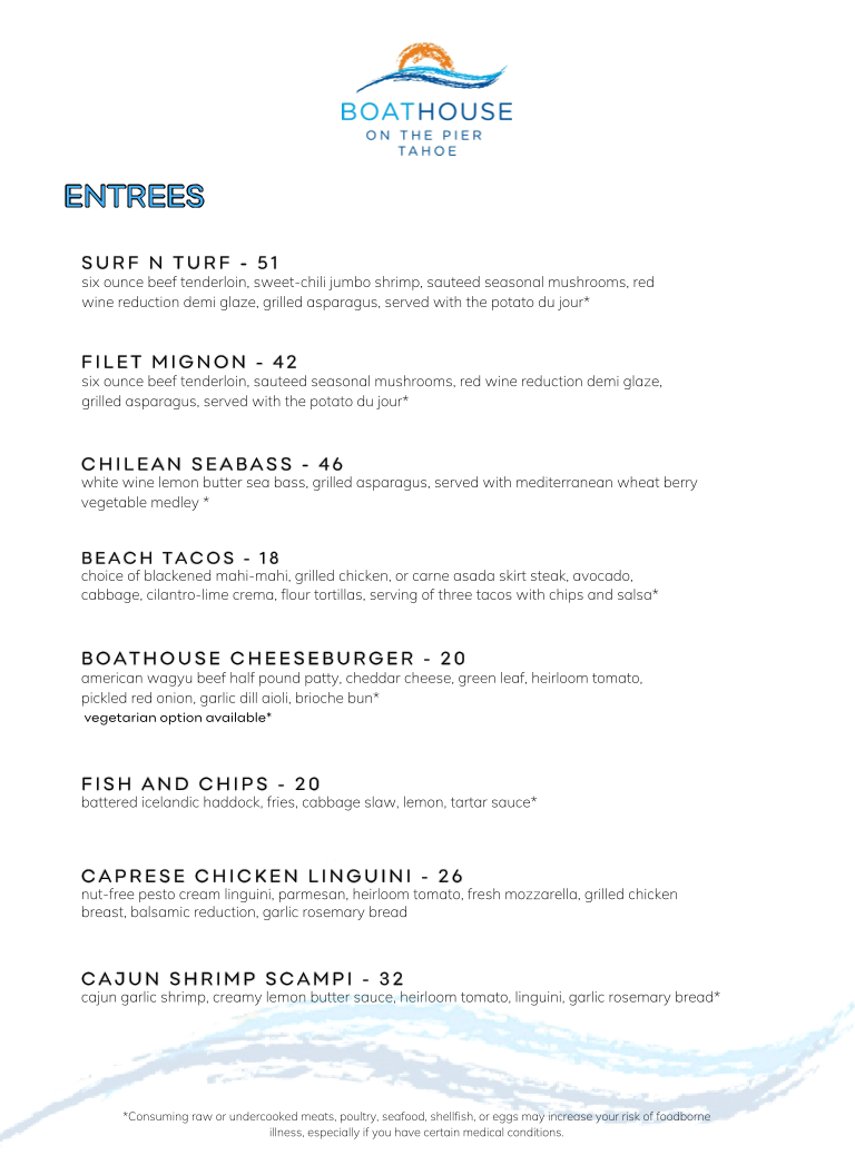 six-ounce beef tenderloin, sautéed seasonal mushrooms, red wine reduction demi-glace, and grilled asparagus, served with the potato du jour.
