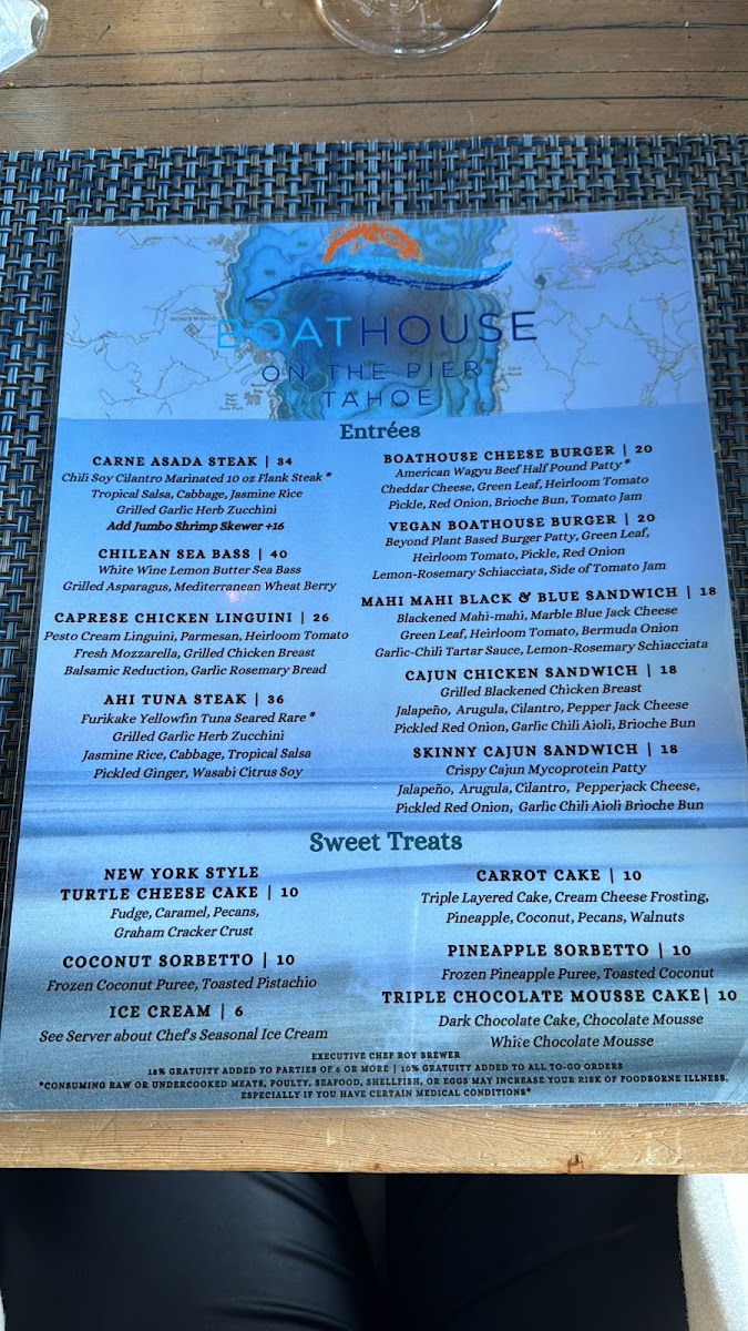six-ounce beef tenderloin, sweet-chili jumbo shrimp, sautéed seasonal mushrooms, red wine reduction demi-glace, and grilled asparagus, served with the potato du jour.