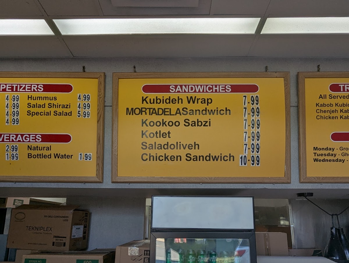 This is a takeout shop that is owned by the famous Shamshiry restaurant across the street. Perfect place to pick up delicious Persian sandwiches made with fresh baked bread. You can also pick up catering orders such as a tray of the eggplant dip. You can ask them to create sandwich trays for your parties and cut them into smaller sizes for ease. I really like the mortadella and salad olivieh sandwiches! This place is a hidden gem!