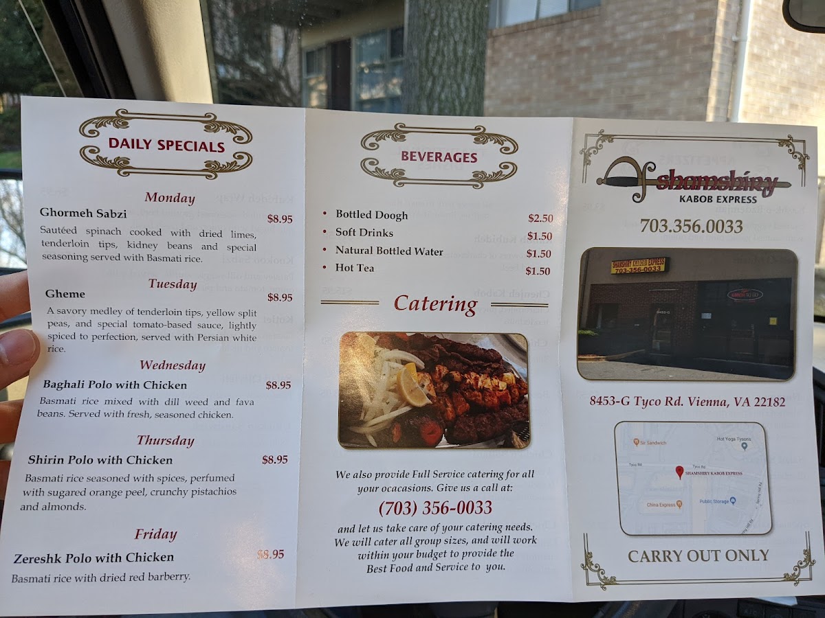 tenderloin chunks of lamb kabob topped with tzatziki sauce, served with mixed greens in a tandoori naan (afghan bread) and a side of vegetables.