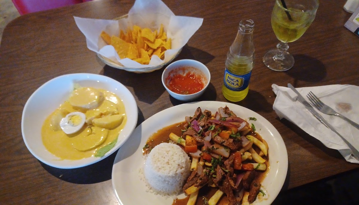 I quite enjoyed this place, but just had one issue. The staff were nice but there was only 2 for the entire restaurant, which was quite empty on a Thursday night. You are served a thing of tortilla chips and a spicy salsa. I had a steak with white rice, over easy egg and guacamole. I loved the guacamole, it was seasoned perfectly and creamy. The over easy egg was done perfectly and the white rice was great! The steak could have been really good but I asked for medium and it was well done, so it was tough, the flavors were good though. The paella valanceaga was pretty good! It's not a typical paella but a rice made and then added in meat like shrimp, squid, octopus, green mussels, and sausage. The rice had some spiciness to it that reminded me of a seafood seasoning, overall it was quite delicious! As for the drinks I had the lime frozen margarita and it was delicous! I definitely recommend trying this place out if you want to try some more of the authentic Latino and Peruvian dishes.