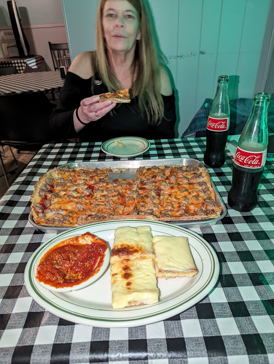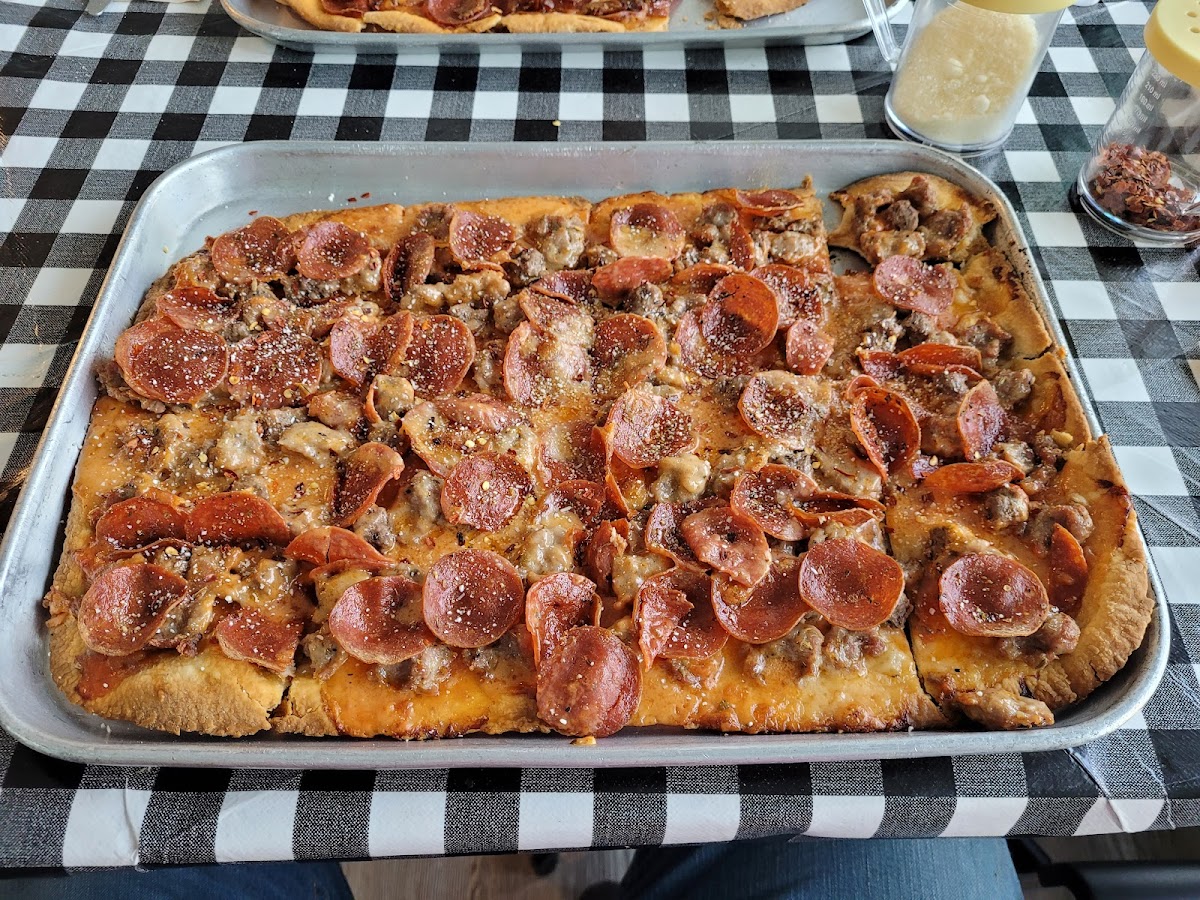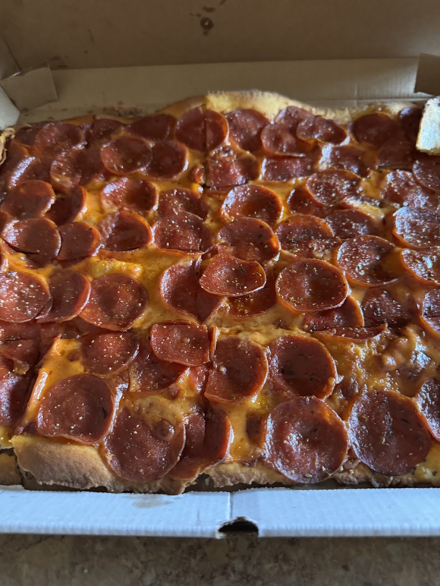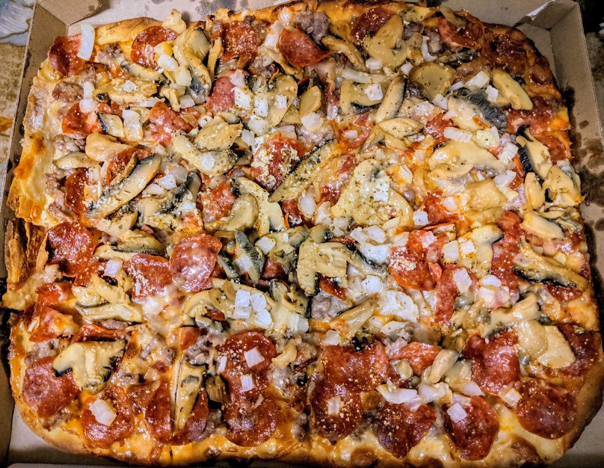 I ordered the large supreme with the fried ravioli as an appetizer. The ravioli was really good with the meat sauce. The pizza had tons of toppings and the pizza sauce combined with the cheese set it apart from any other pizza that i have eaten. It is a St. Louis style pizza but it was the best pizza of any kind that i have ever eaten.