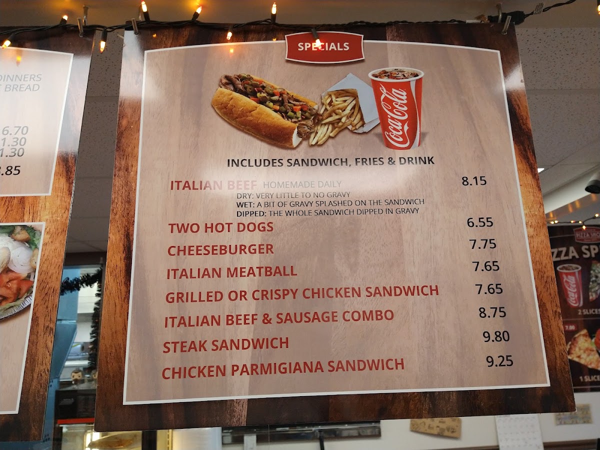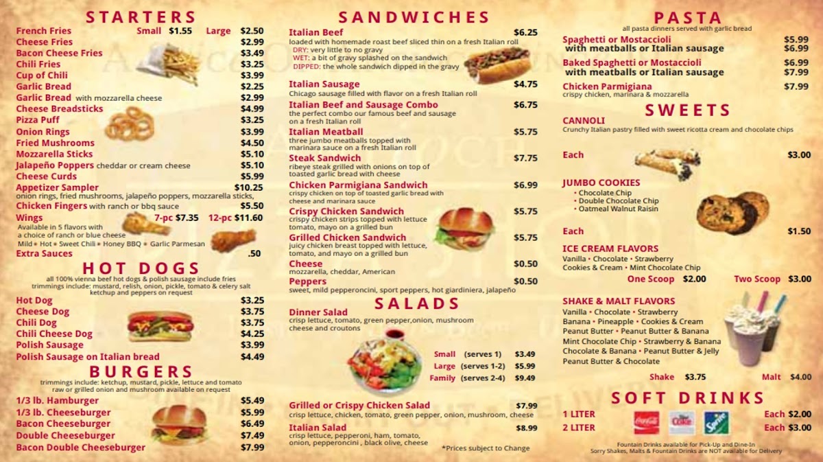 homemade tender Italian Beef and Italian sausage link on top of our fresh baked bread with the option to add your choice of peppers and cheese, includes small fry & fountain drink