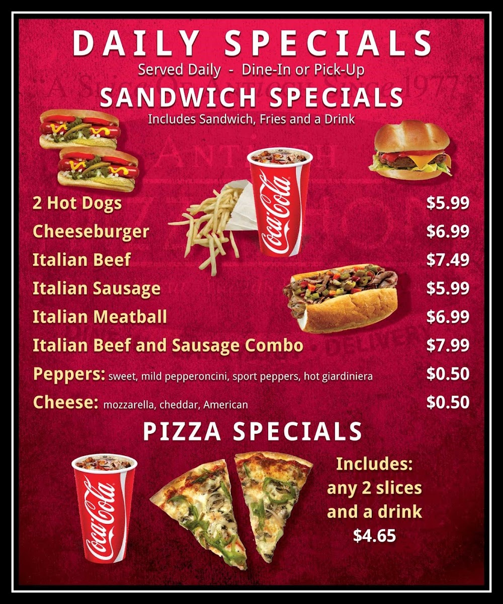 2 pizza slices & drink • DAILY SPECIAL FLAVORS • monday•bbq chicken / tuesday•stuffed pepperoni / wednesday•western / thursday•buffalo chicken / friday•bacon double cheeseburger